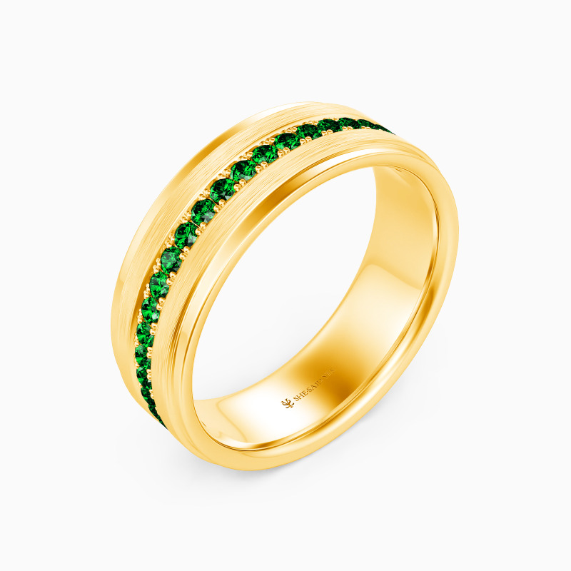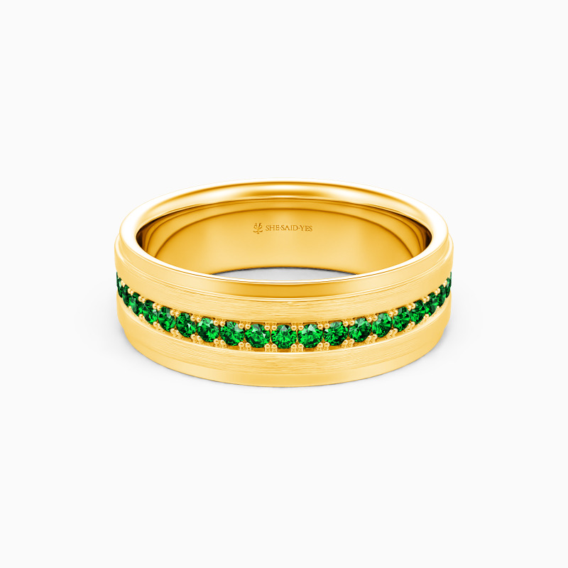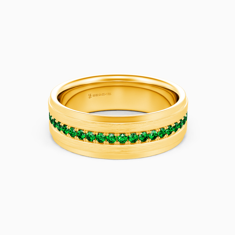 Depict an on-trendy style with precious metal and unique design; A row of shimmering round gemstones is spread across the band, with a sleek brushed finish accented alongside for a further level of sophistication. This dreamy eternity wedding band incorporates the ultimate craftsmanship for your ideal wedding.