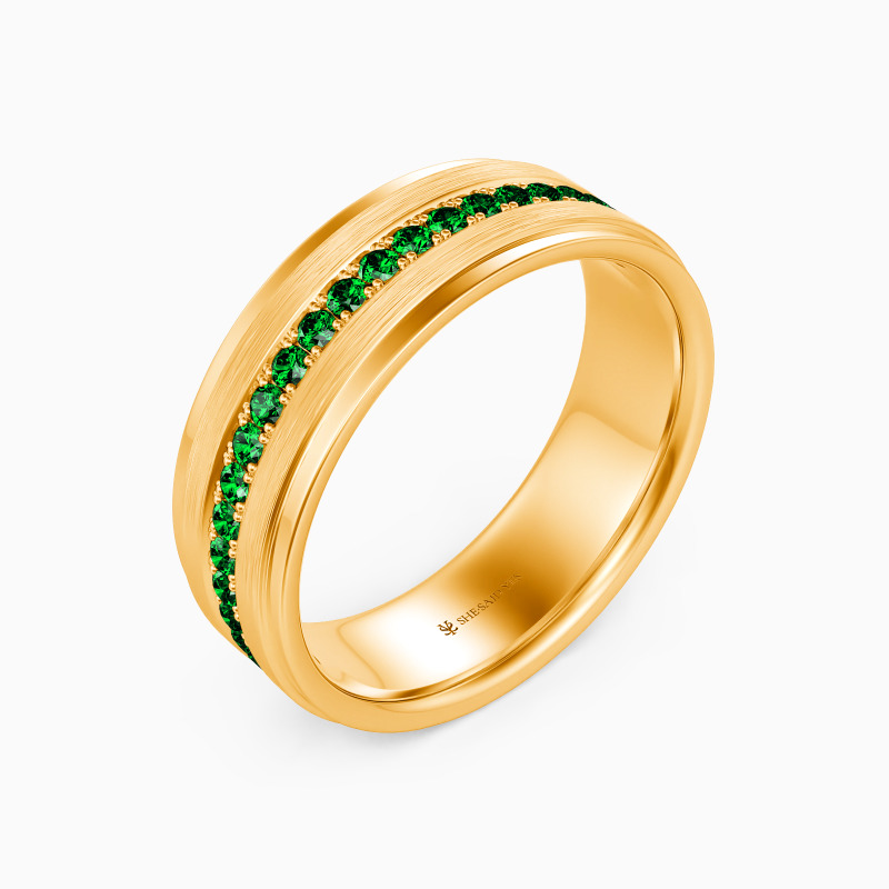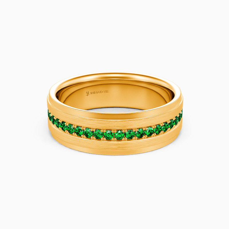 Depict an on-trendy style with precious metal and unique design; A row of shimmering round gemstones is spread across the band, with a sleek brushed finish accented alongside for a further level of sophistication. This dreamy eternity wedding band incorporates the ultimate craftsmanship for your ideal wedding.