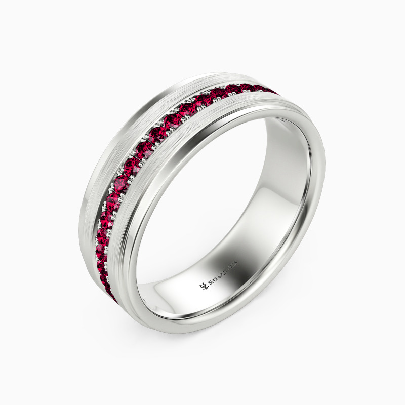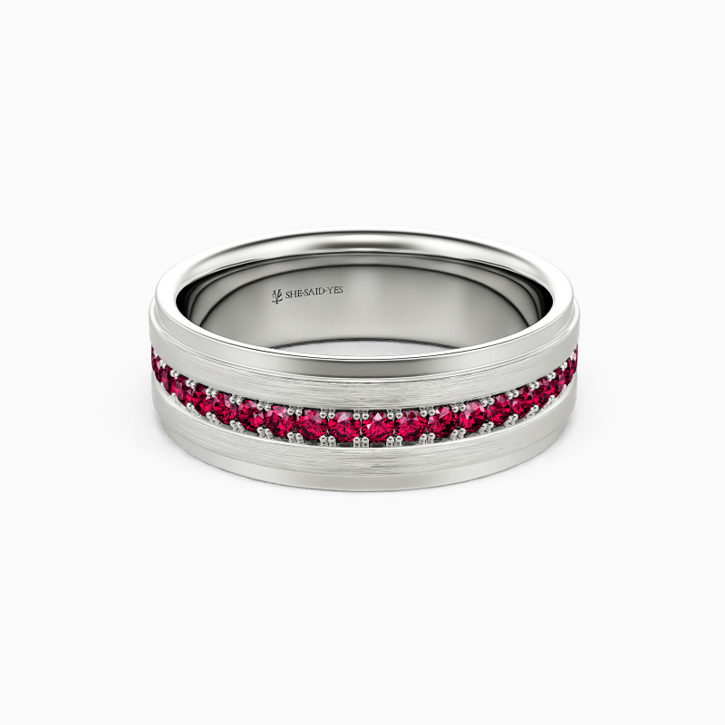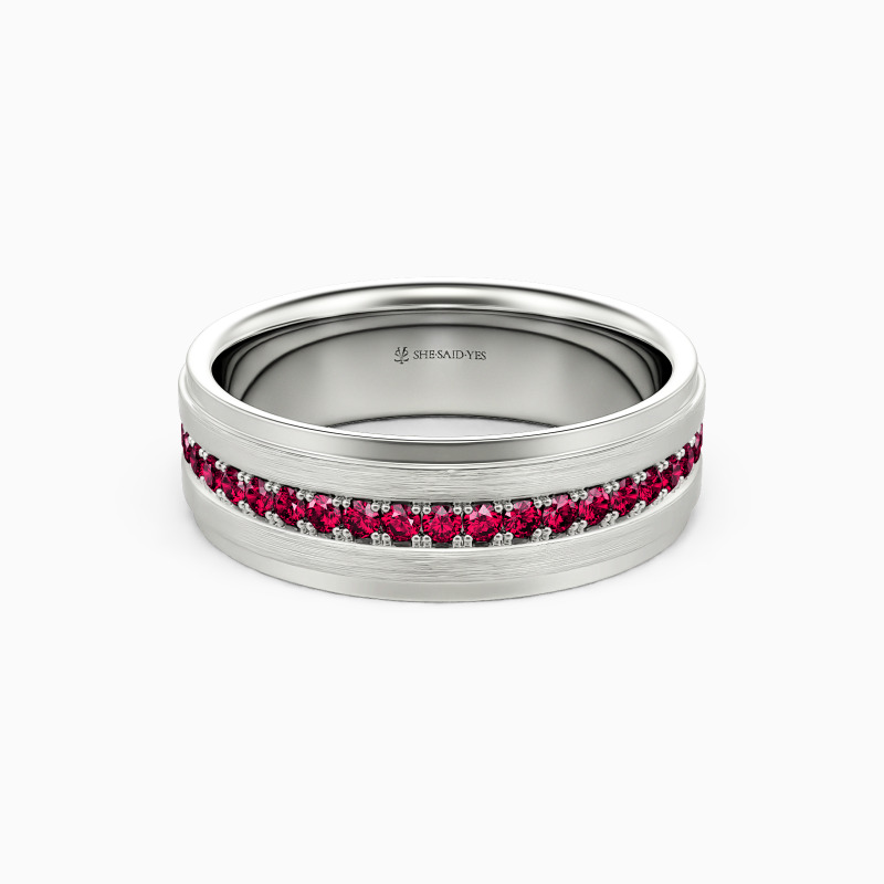 Depict an on-trendy style with precious metal and unique design; A row of shimmering round gemstones is spread across the band, with a sleek brushed finish accented alongside for a further level of sophistication. This dreamy eternity wedding band incorporates the ultimate craftsmanship for your ideal wedding.