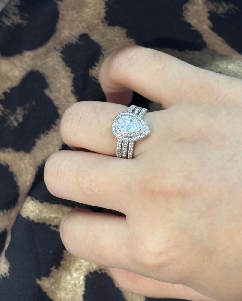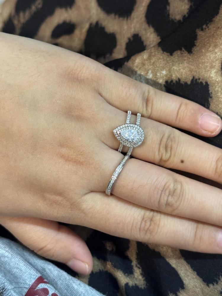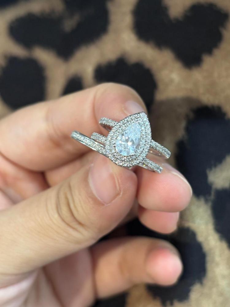 This captivating bridal set boasts a show-stopping pear-cut center stone surrounded by double halos, elevating its brilliance and adding an extra layer of protection. The shimmering side stones on the shank highlight the intricate detail of this set, adding to its overall enchantment. Plus, the interchangeable wedding band provides a unique and customizable option to this already exquisite design. Crafted with exquisite attention to detail, this bridal set is a true reflection of love, elegance, and style, perfect for any blushing bride-to-be.