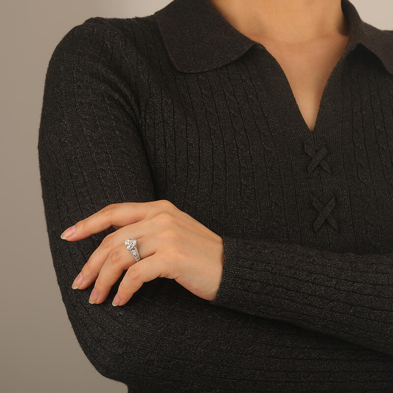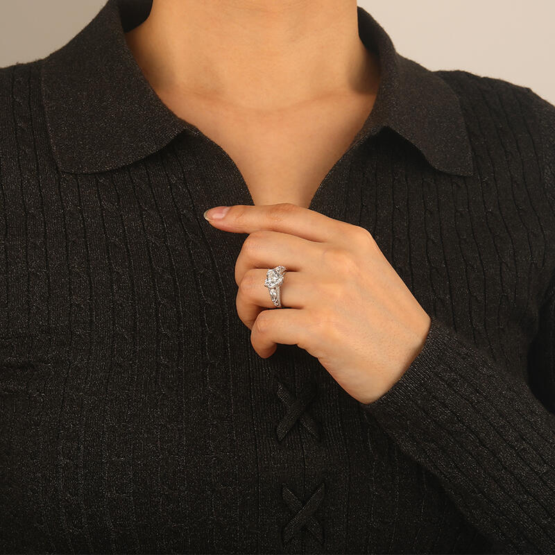 This breathtaking engagement ring is the epitome of romance and sophistication. A heart-cut gemstone sparkles at the center of this stunning piece, representing the all-encompassing love that brings two people together. Two pear-cut gems gracefully balance the centerpiece, adding to its beauty and elegance. Intricately crafted accents enhance the ring's beauty even further, with two rows of exquisite detailing bringing out its loveliness. As an unexpected detail of sheer beauty, the inner shank of the ring boasts a heart shape visible from the underside of the ring. Perfect for the hopeless romantic, this engagement ring is an eternal symbol of love that will bring you joy and warmth for a lifetime.