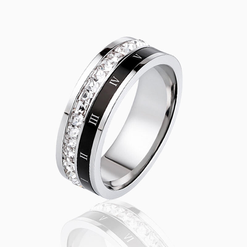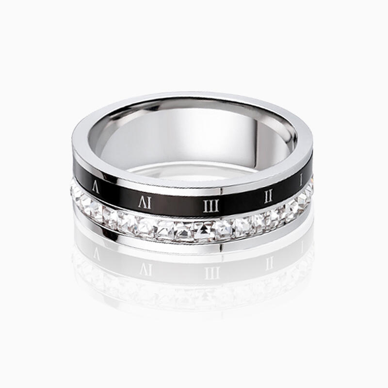 Forged from resilient 316L titanium steel, the band balances lightweight comfort with enduring strength. The black ceramic inlay is engineered for seamless rotation, its scratch-resistant surface maintaining a sleek, matte finish. Each gemstone is securely channel-set for lasting sparkle without compromising the ring's clean lines. Together, these materials unite form and function, resulting in a wedding band as uncompromising as the bond it represents—bold enough to stand out, refined enough to last a lifetime.