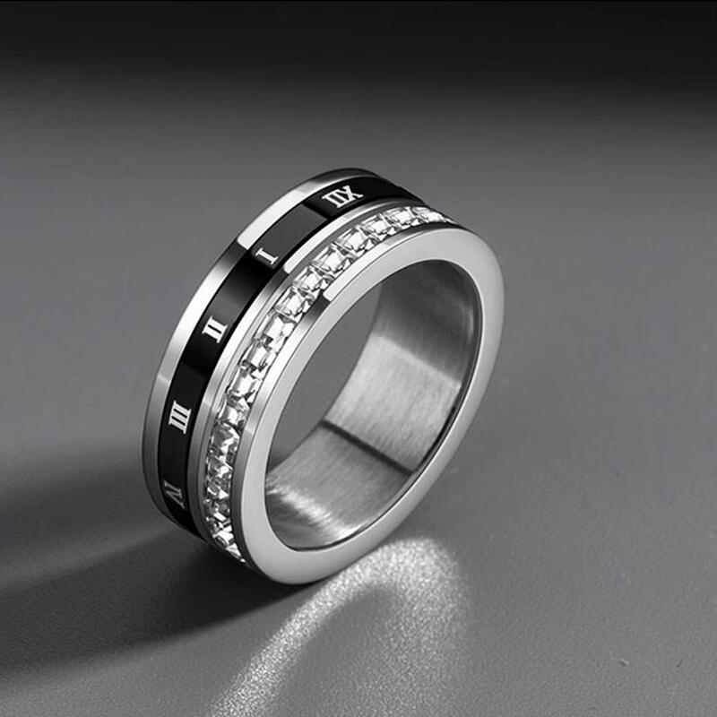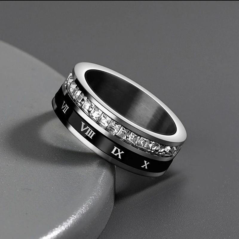 This men's wedding band masterfully blends two striking elements. A sleek channel-set gemstone row delivers refined brilliance, while a rotating black ceramic ring adds dynamic texture with engraved Roman numerals. The contrast between structured sparkle and fluid motion creates a bold yet balanced aesthetic, perfect for the modern groom.