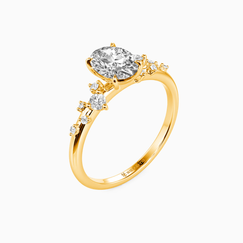 Indulge in the meticulous craftsmanship of this captivating side-stone engagement ring. Its stunning four-prong setting elegantly highlights the mesmerizing oval center stone. Adorned with five round gemstones, artfully scattered in varying sizes on both sides, it radiates sophistication and uniqueness. The highly polished shank adds a brilliant touch, making it a symbol of everlasting love. Embrace the beauty that transcends time with this remarkable masterpiece.