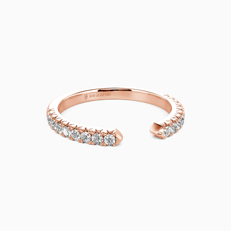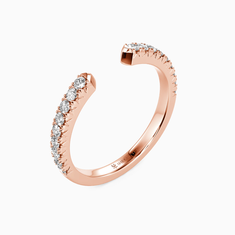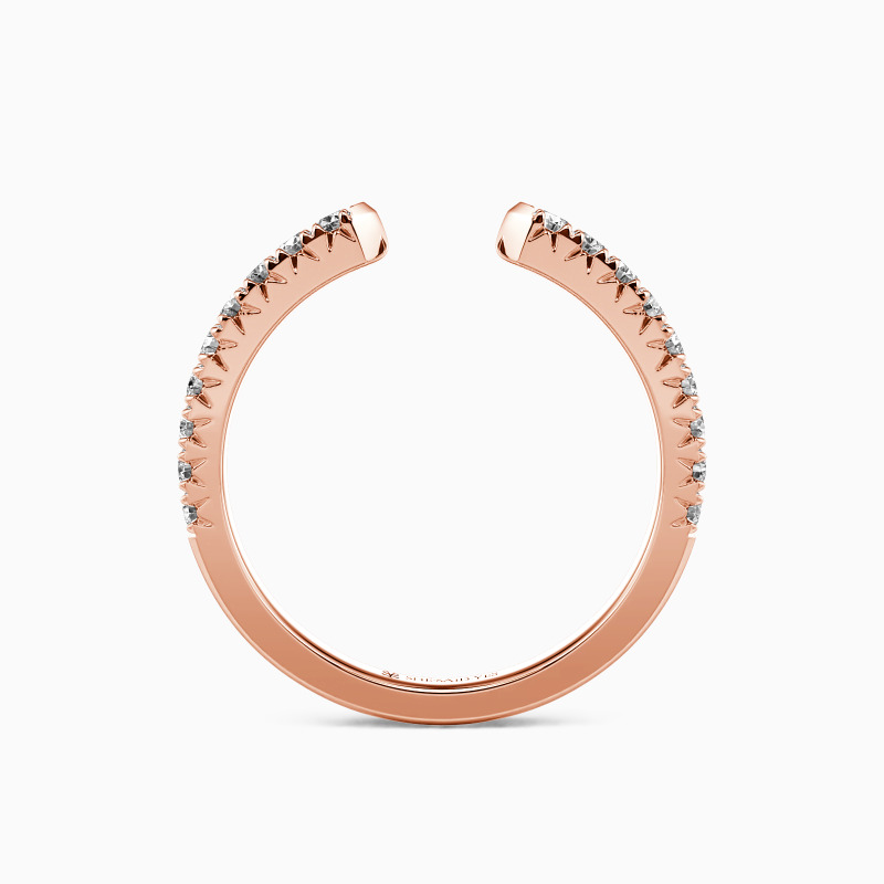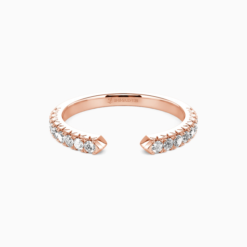 This open wedding band exudes sophistication, adorned with French pavé-set gems on half its length, offering a subtle yet captivating sparkle. Its open design ensures versatility, effortlessly complementing any engagement ring. It is a harmonious blend of tradition and modernity, symbolizing the love as unique and radiant as the gems it carries.