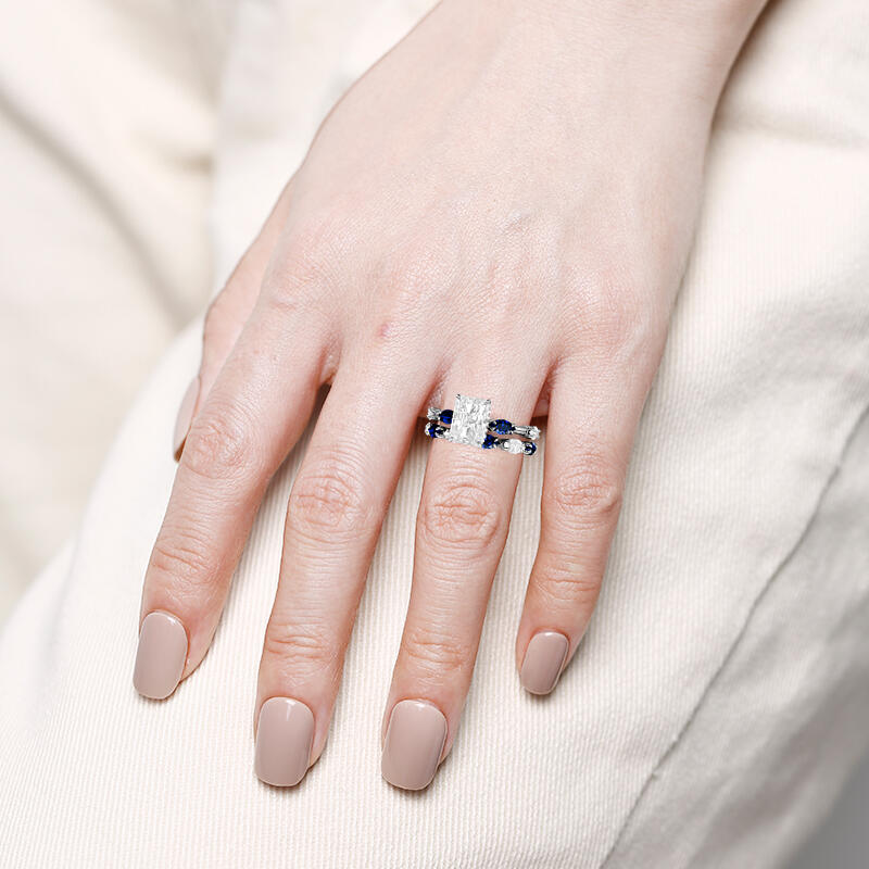 This exquisite bridal set marries timeless elegance with modern flair. The engagement ring boasts a radiant-cut centerpiece nestled in a hidden halo, flanked by two marquise gems on each side. The matching wedding band features six marquise-cut stones, perfectly complementing its partner. Together, they create a harmonious duo symbolizing eternal love and commitment.