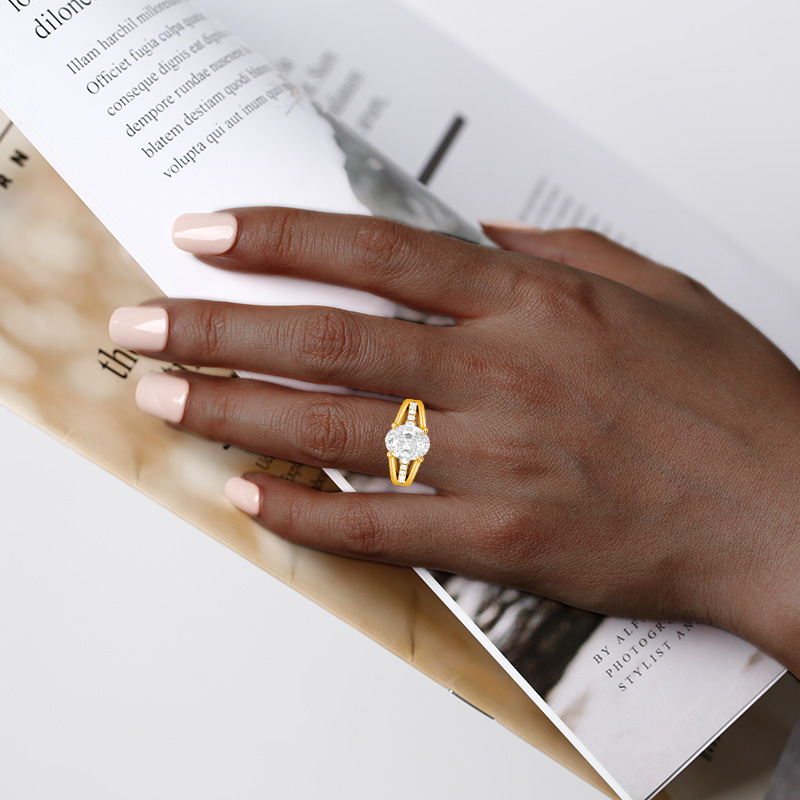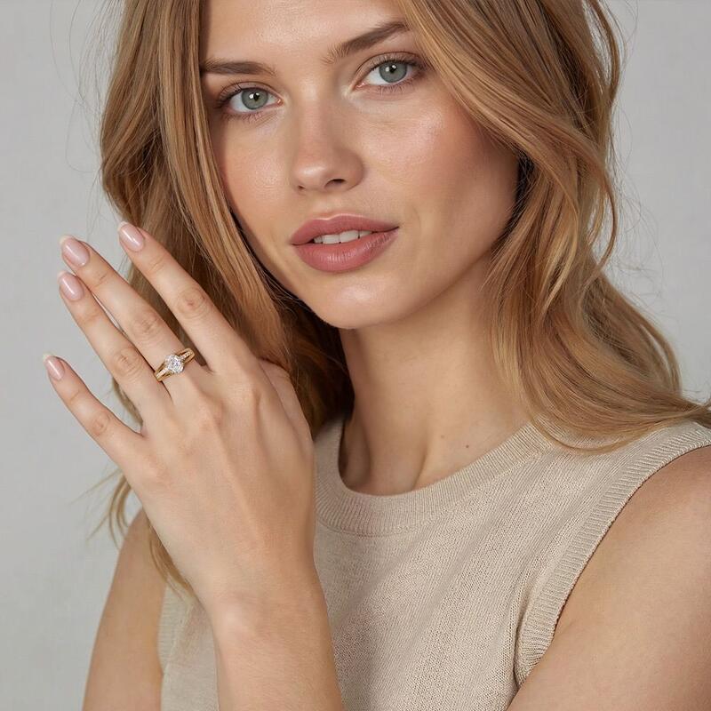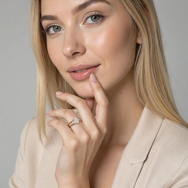 This exquisite engagement ring showcases a radiant oval-cut center stone embraced by a subtle hidden halo. The ingeniously designed split shank gracefully elevates the centerpiece, creating a cathedral silhouette. Beneath, the meticulously pavé-set gallery adds dimension and sparkle, ensuring brilliance from every vantage point. With its perfect blend of timeless elegance and modern elements, this ring is a dazzling symbol of your love.