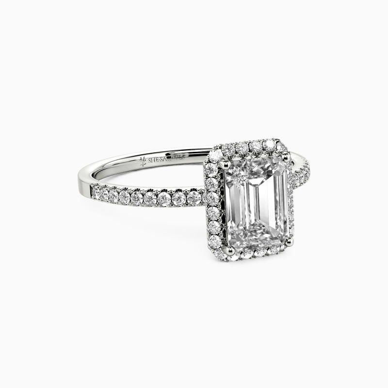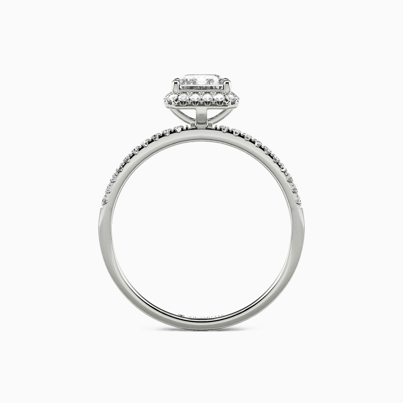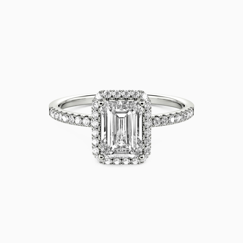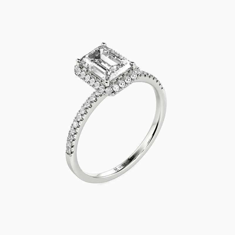 Unveil your love with this halo engagement ring, featuring a mesmerizing emerald-cut center stone. Surrounded by a sparkling halo and set on a paved shank, every detail exudes sophistication and charm. This ring is more than a piece of jewelry; it's a testament to a love story as enduring as the stone at its heart.