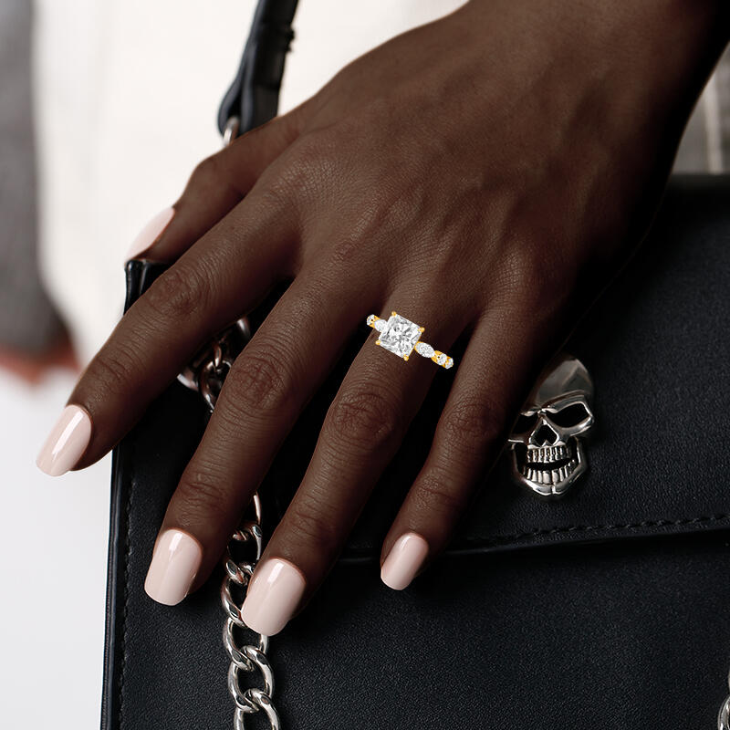 This radiant-cut, side-stone engagement ring is a testament to timeless elegance. The central stone's brilliance is amplified by marquise and round side stones delicately held in a single-prong setting. A perfect blend of classic and contemporary styles, it is a symbol of a unique and enduring love story, capturing hearts with its exquisite charm.