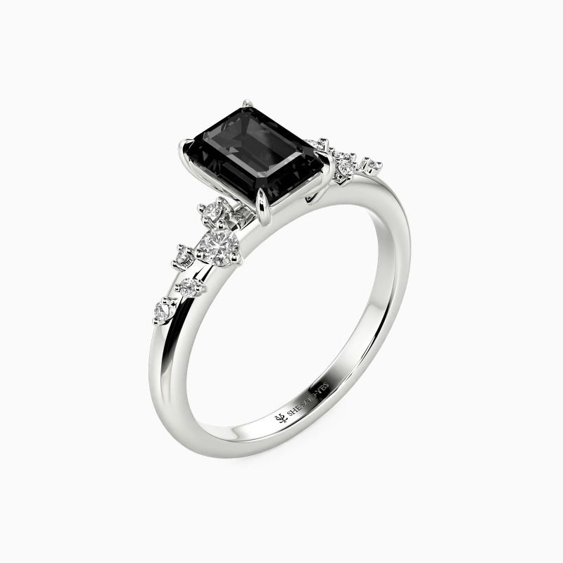 Elevate your style with this captivating side-stone engagement ring. It boasts an emerald-cut center stone that exudes sophistication and grace. Meanwhile, five round gems in varying sizes adorn each side, delicately scattered to enhance the ring's allure. This exquisite piece strikes the perfect balance between classic elegance and modern charm, symbolizing a timeless and vibrant love.