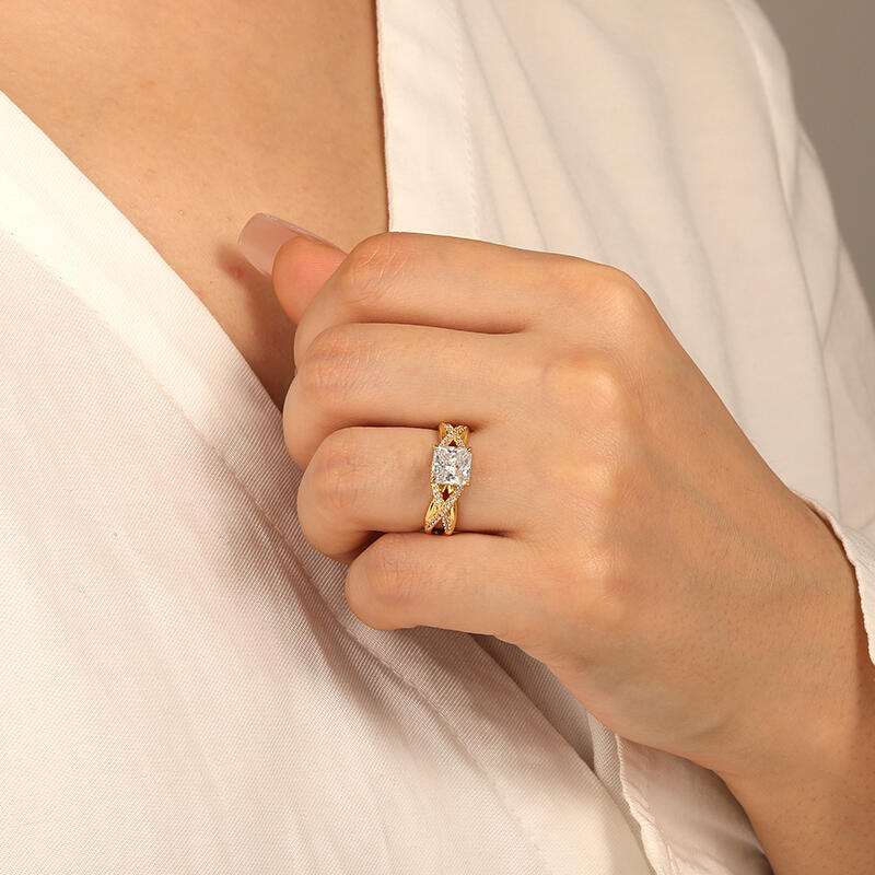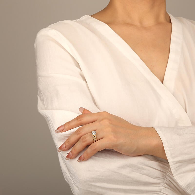 This captivating engagement ring captures the essence of eternal romance. A stunning radiant-cut gemstone forms the focal point, surrounded by delicate split shanks designed in an infinity shape. The shanks' graceful crisscrossing accentuates and frames the center stone's flawless facets, symbolizing the unending nature of love.