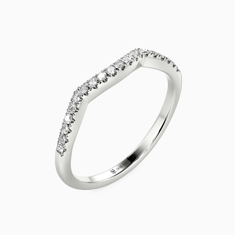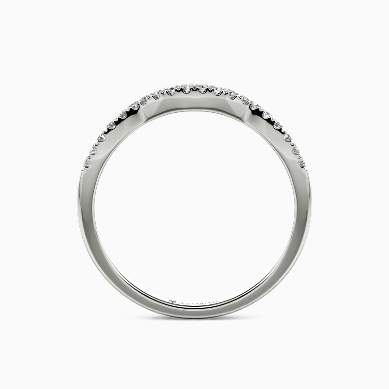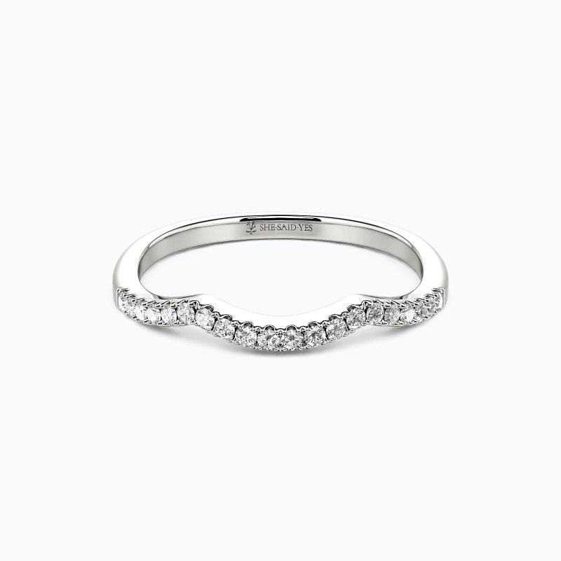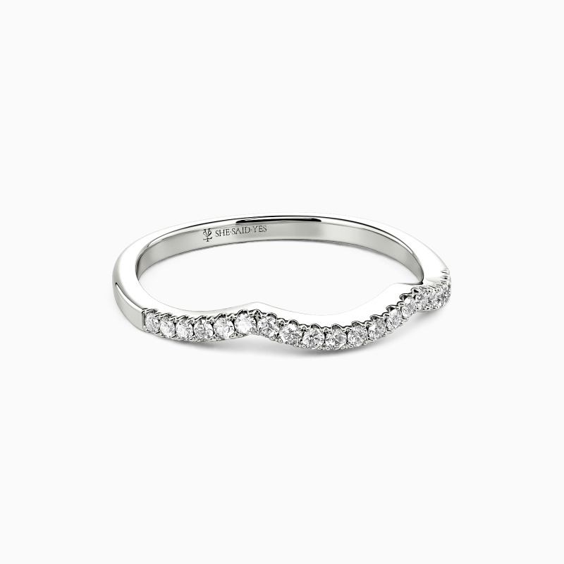 This wedding band features a stunning curved design meticulously paved with gemstones. Its elegance and sophistication make it a versatile piece that can be worn alone as a symbol of eternal love or paired flawlessly with the engagement ring, creating a harmonious and captivating ensemble to commemorate your special day.