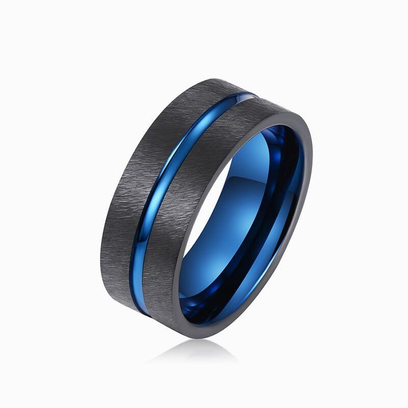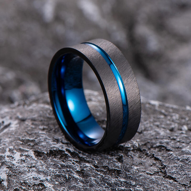 Constructed from 85% tungsten carbide, this ring promises exceptional durability and a satisfying heft. The black finish amplifies its modern appeal while preserving the material's hypoallergenic qualities and resistance to scratches and tarnishing. The blue accents provide a refreshing twist, resulting in a wedding band that balances sophistication with a touch of individuality.