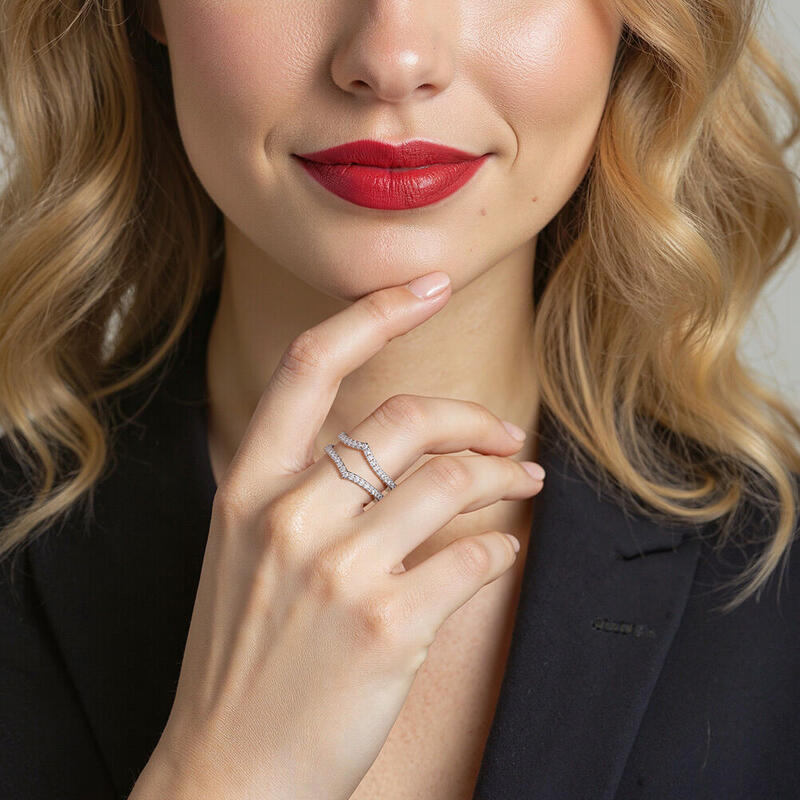 This exquisite enhancer is a testament to timeless elegance, designed to elevate the beauty of any engagement ring it accompanies. Its graceful V-shaped silhouette is adorned with meticulously set stones, creating a cascade of shimmering light. Symbolizing the union of two souls, this piece adds brilliance and harmony to your bridal ensemble, making it a stunning and versatile addition to your jewelry collection.