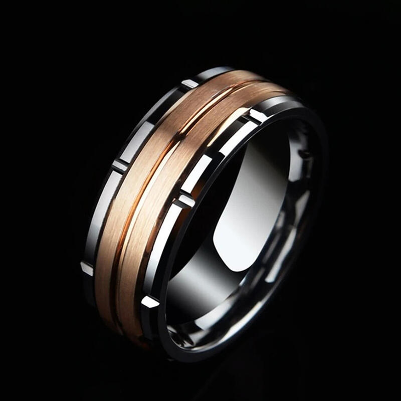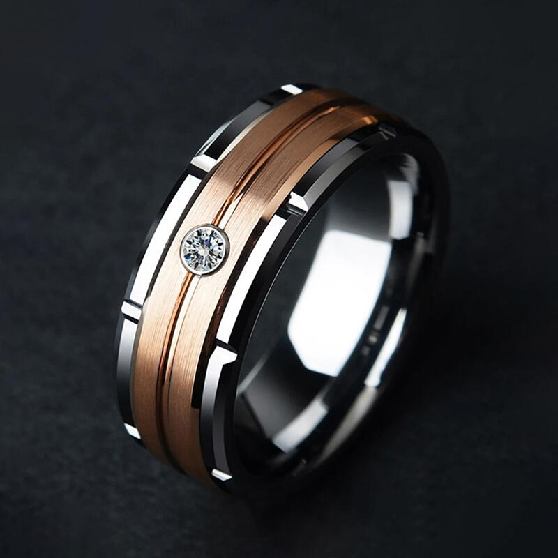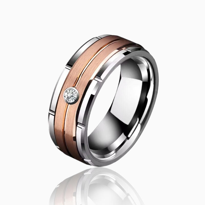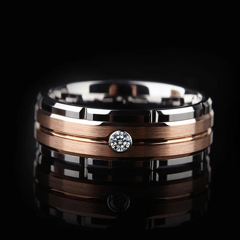 This captivating men's wedding band exudes strength and sophistication. A mesmerizing round gem takes center stage, serving as a radiant focal point. Delicate grooves encircle the band, adding depth and texture to its design. The rose gold brushed finish lends a warm, contemporary touch, creating a harmonious contrast with the ring's robust structure and enhancing its overall appeal.