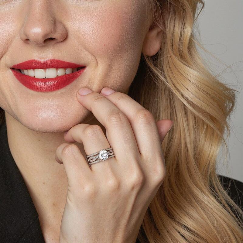 This interchangeable bridal set is designed to capture your eyes. The engagement ring boasts a breathtaking round-cut center stone, gleaming brightly at the band's top. The hidden halo and side-paved gemstones add extra sparkle and shine, making it truly dazzling from every angle. The matching ring features two gemstone-paved ribbons that intertwine together, symbolizing the bond of love between two people. Whether you wear them together as a set or mix and match them with other rings, this bridal set will surely be a beloved treasure for years to come.