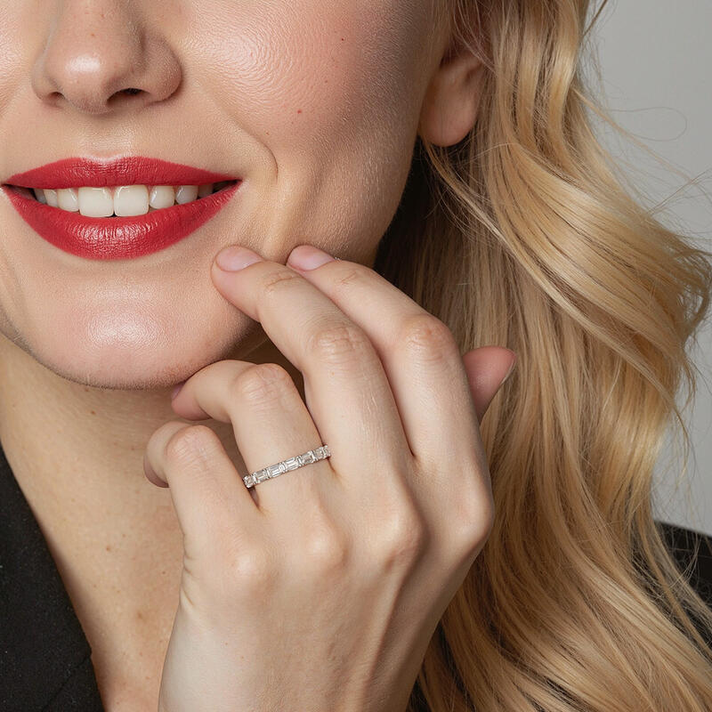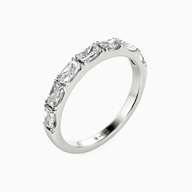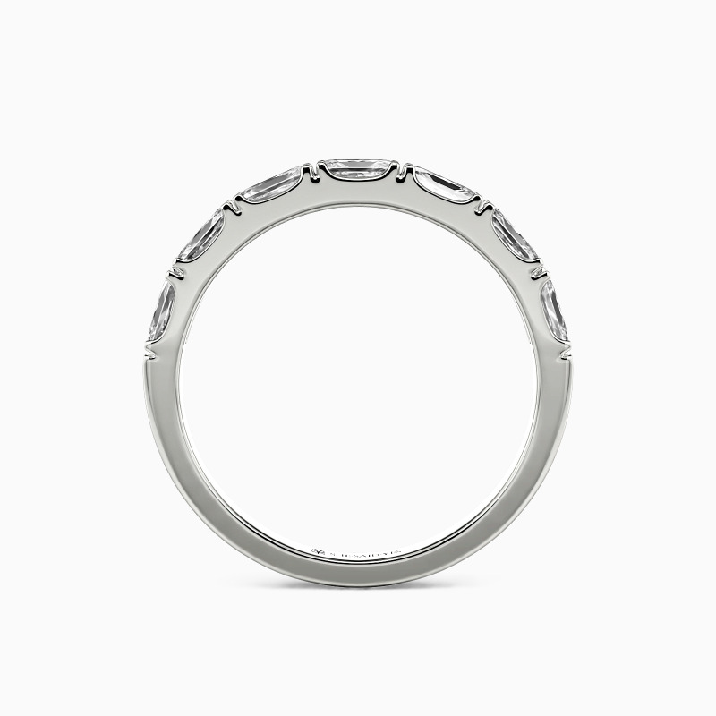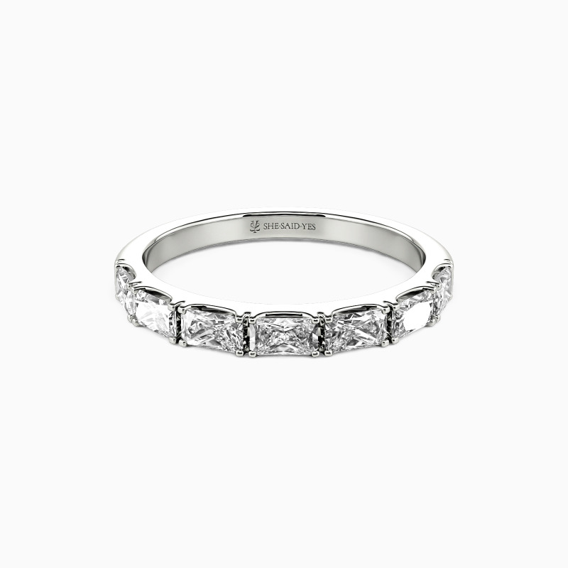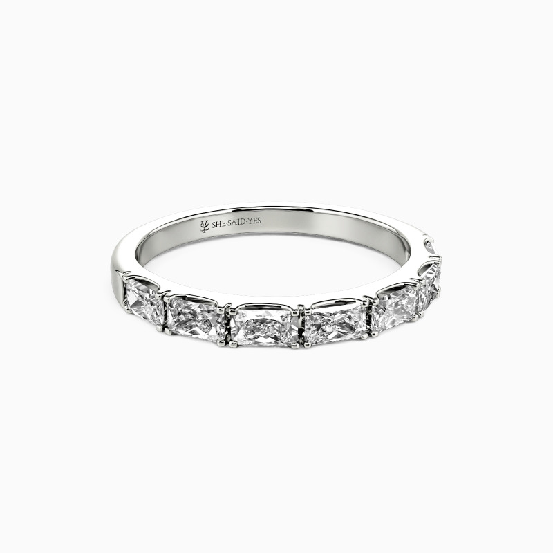 This stunning piece is meticulously crafted with seven baguette-cut gemstones, each delicately in a scalloped pave setting. The brilliance of these gemstones is unparalleled, radiating an enchanting allure that symbolizes eternal love and commitment. Immerse yourself in the epitome of refinement and elegance with this wedding band, a testament to everlasting love that transcends fleeting trends.