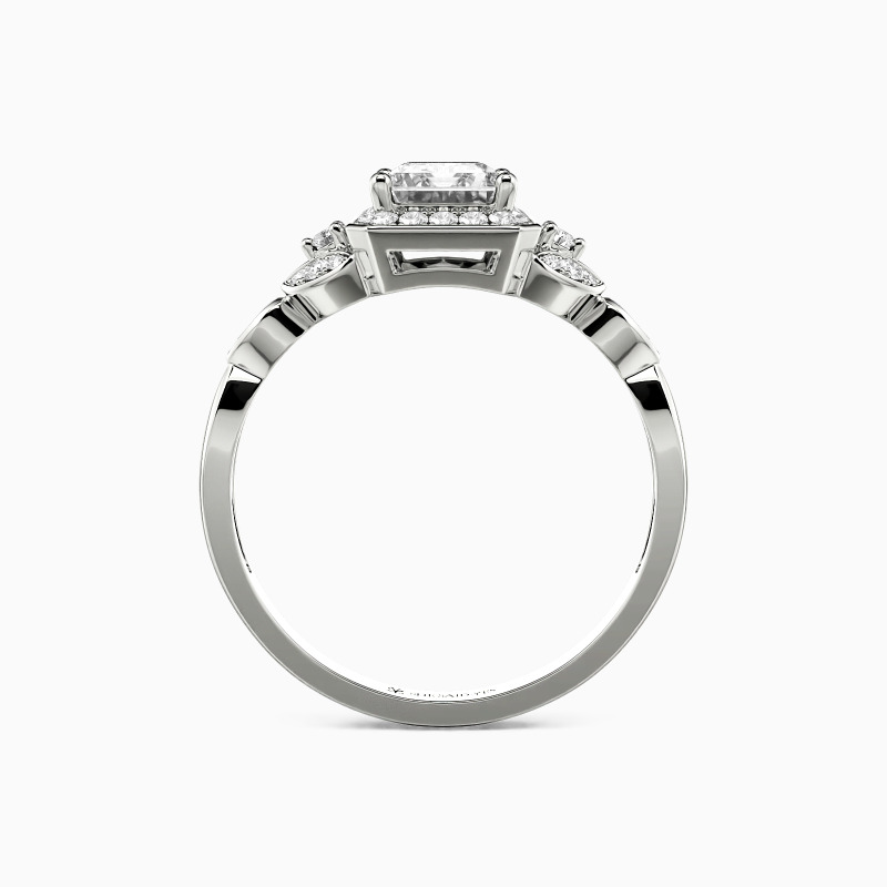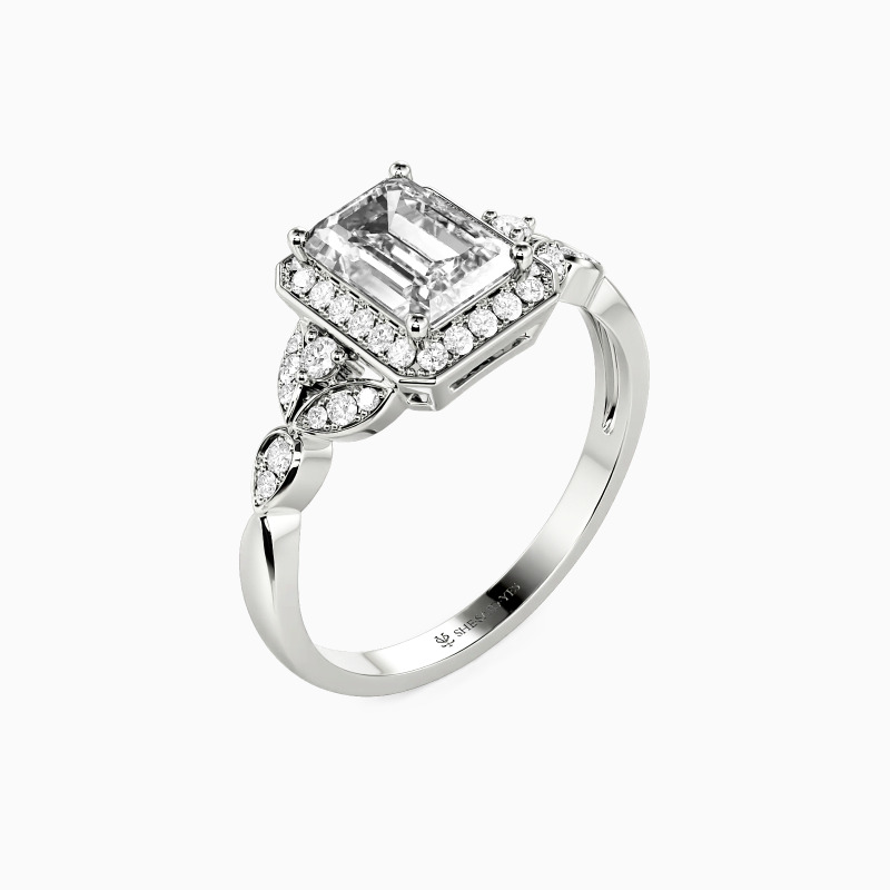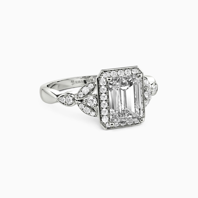This halo engagement ring is a testament to refined craftsmanship, featuring an emerald-cut center stone that exudes a timeless allure. The stone is encircled by a halo of meticulously set gems, enhancing the radiance of the centerpiece. The ring's design is further accentuated by a leaf-like pattern, each leaf intricately adorned with gemstones, lending an air of natural elegance to the piece.