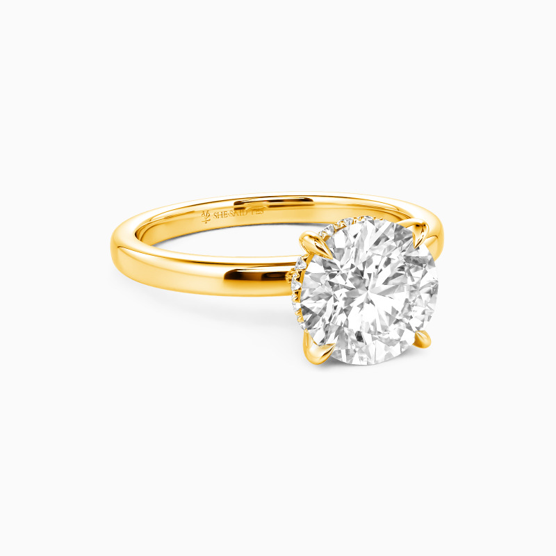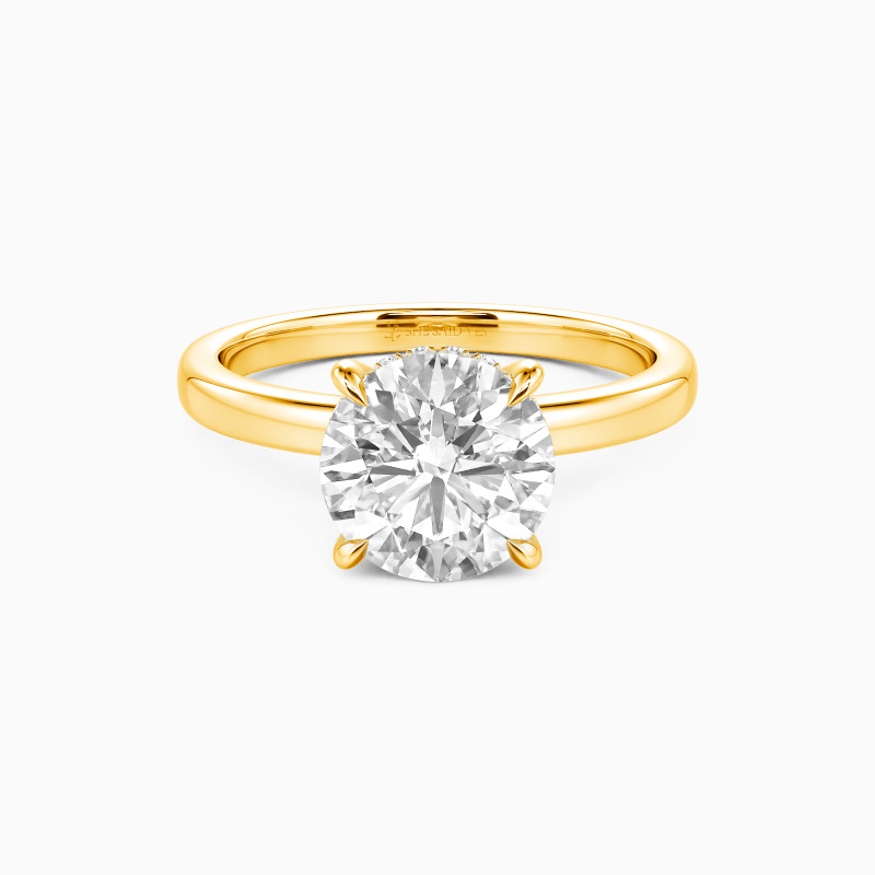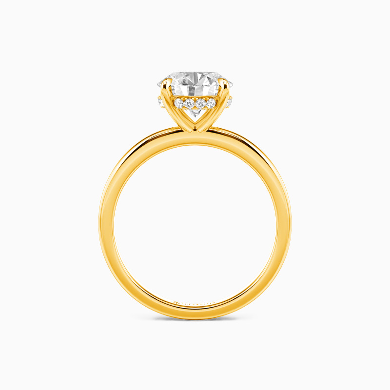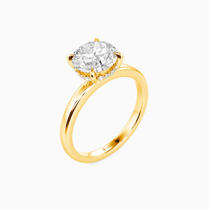 This engagement ring tells a love story with its mesmerizing round-cut center stone. A hidden halo subtly enhances its sparkle, creating a secret allure. The design is completed with a highly polished straight shank that adds a modern touch of elegance. This ring, a symbol of romance and commitment, is a timeless testament to love's enduring promise.