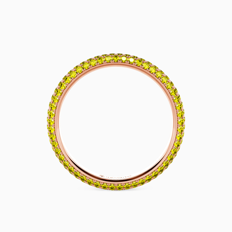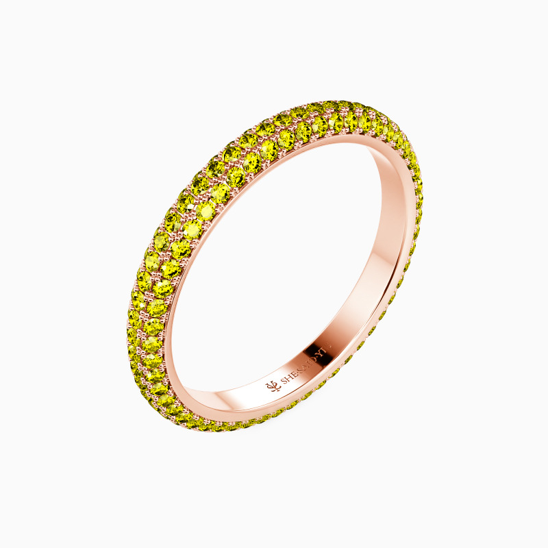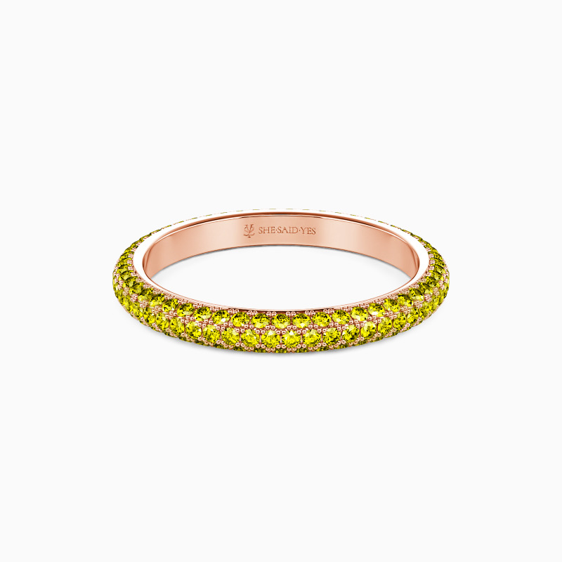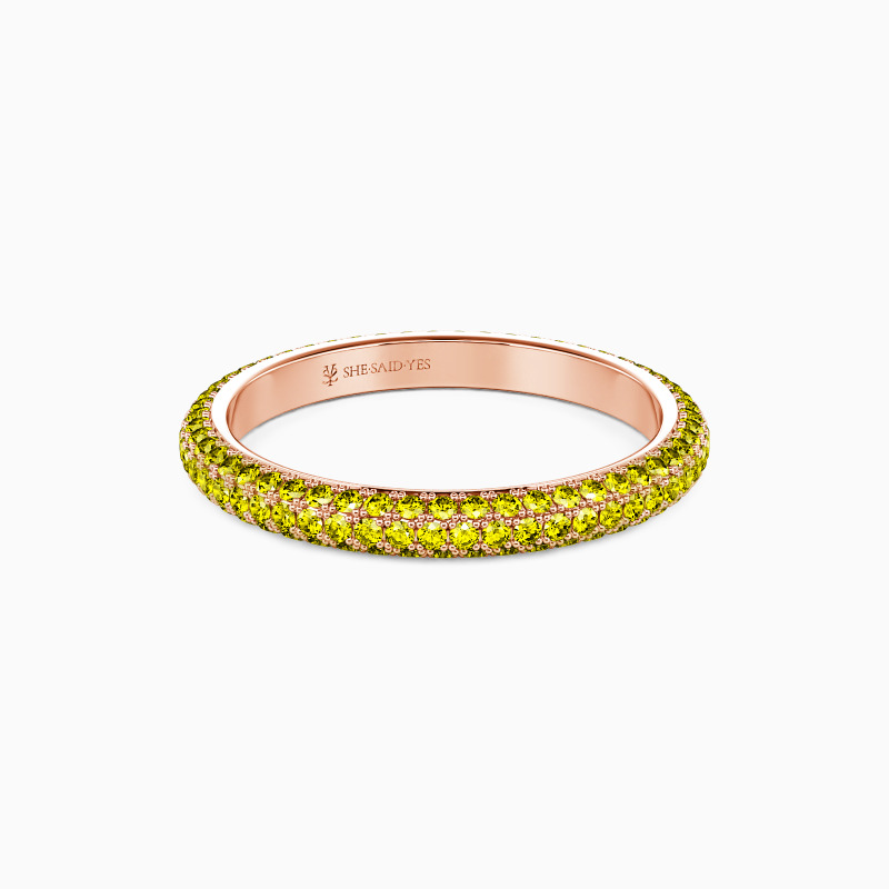 Reflecting the spirit of modern women, SHE·SAID·YES' fine wedding band revealing your chic style flawlessly. A series of gemstones are neatly paved on the thin and slightly raised shank. Shining gorgeously, this lovely piece is versatile for stacking and wearing alone.