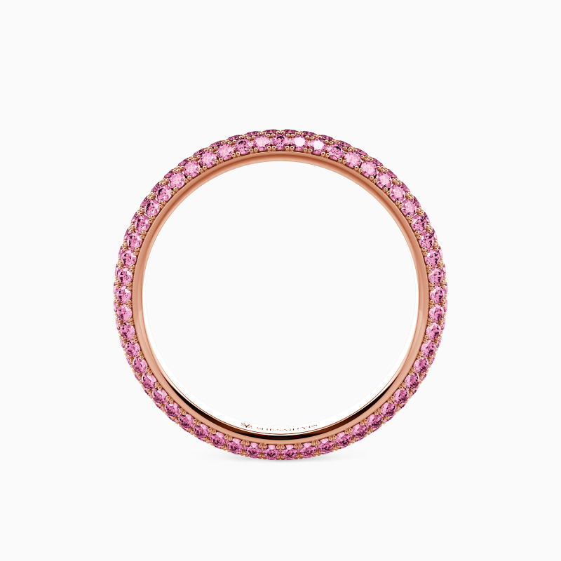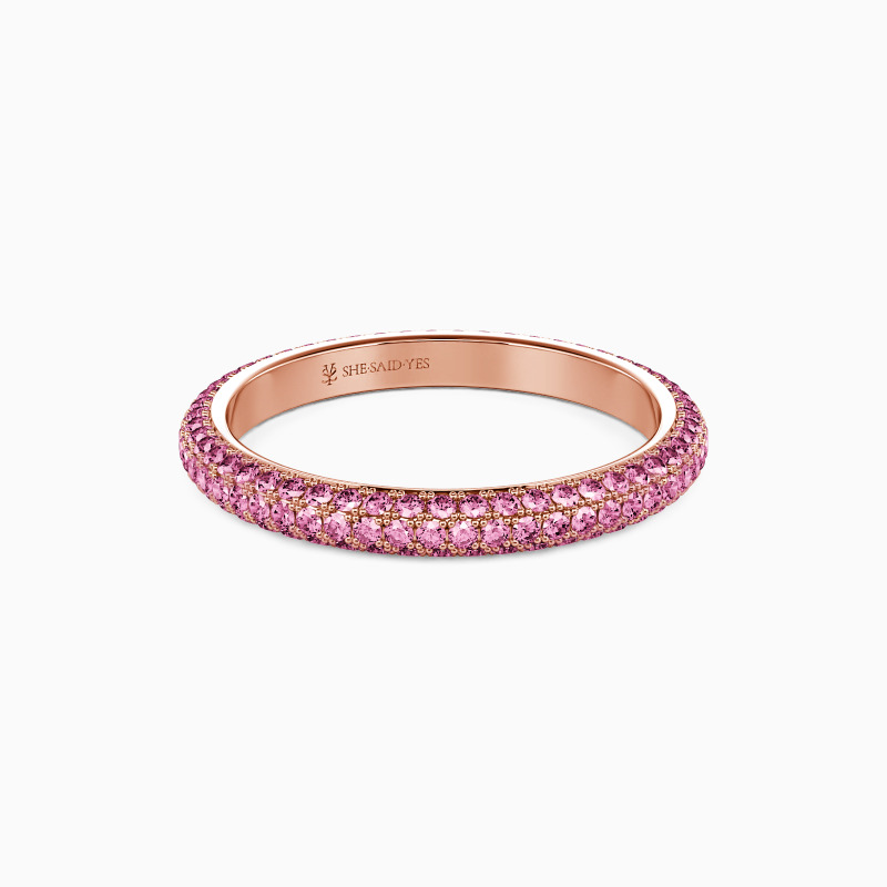 Reflecting the spirit of modern women, SHE·SAID·YES' fine wedding band revealing your chic style flawlessly. A series of gemstones are neatly paved on the thin and slightly raised shank. Shining gorgeously, this lovely piece is versatile for stacking and wearing alone.