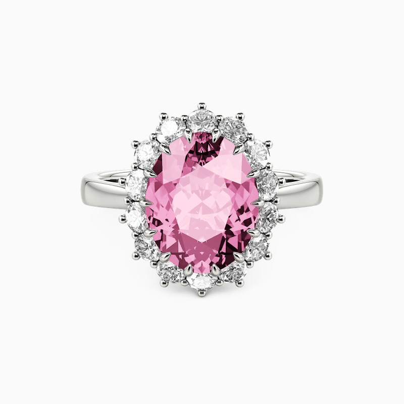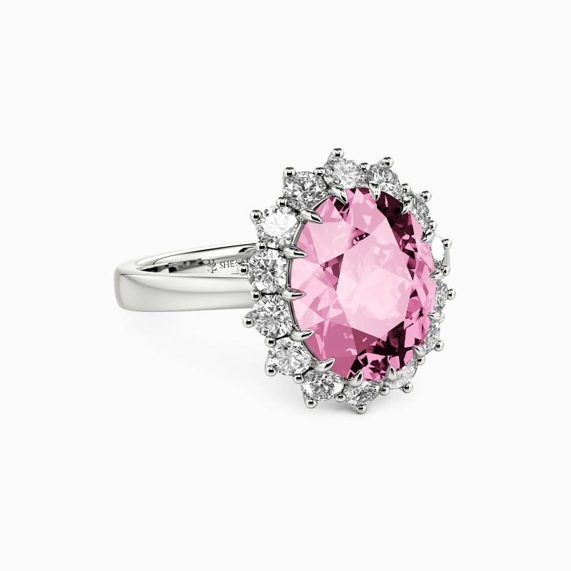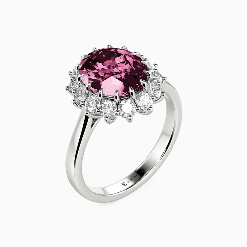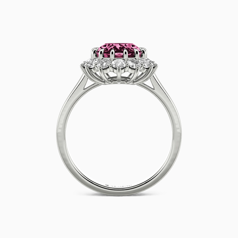 Fashioned from classic glamour, this halo engagement ring features a striking oval-cut center stone surrounded by a halo of round-cut gems. The center stone looks even more brilliant against the halo. Besides, the chrysanthemum basket adds a bit of elegance and sophistication to the whole ring.