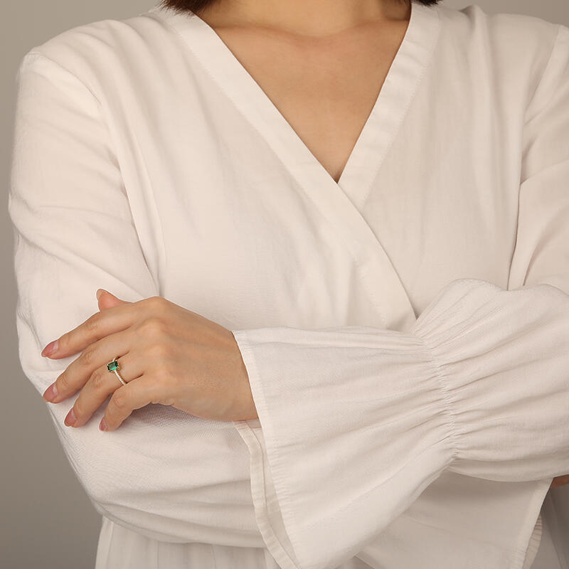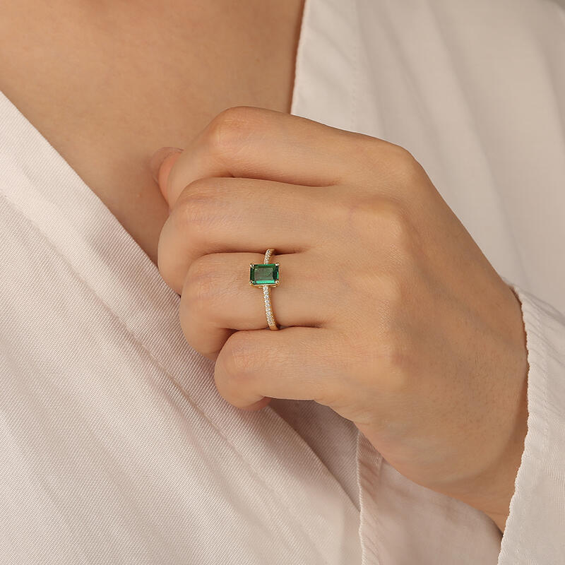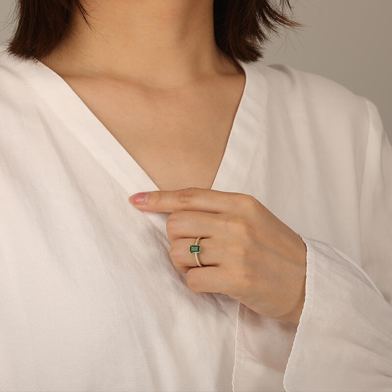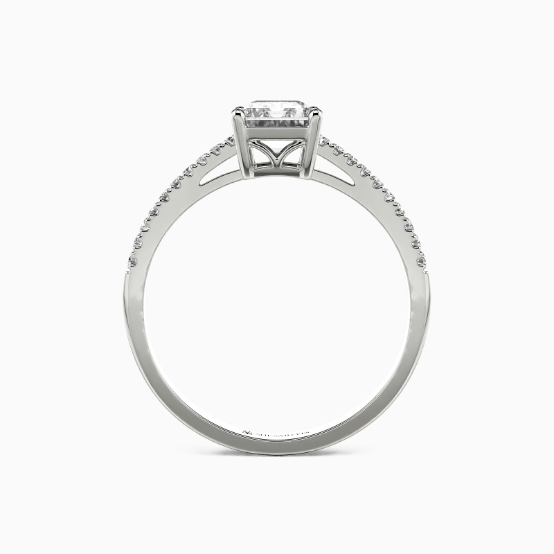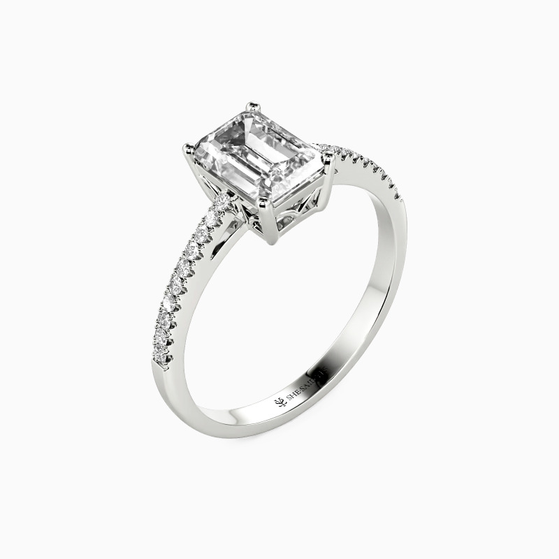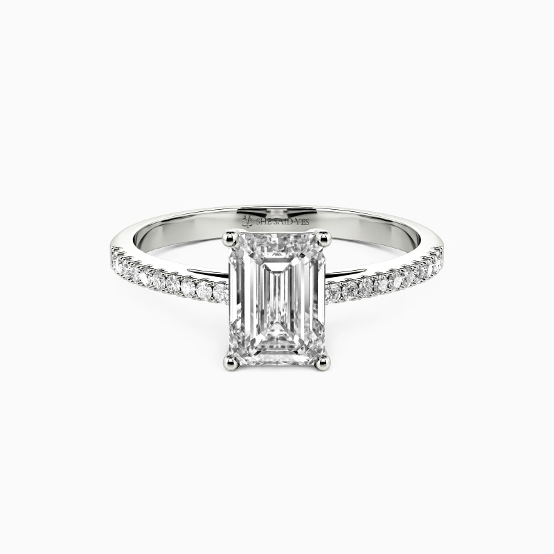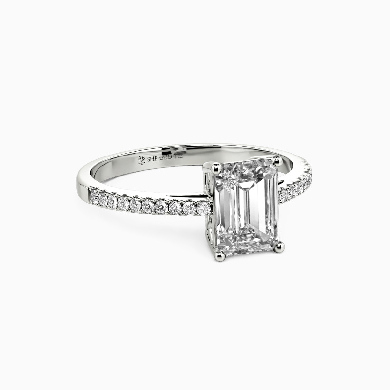 This side-stone engagement ring is a true testament to timeless elegance. The emerald-cut center stone, with its distinct glamour, is the focal point of this exquisite piece. Embellished with a pave shank, glittering with small round gems, this ring is destined to leave a memorable impact on your special day.