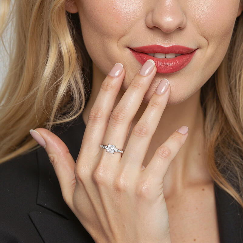 Ask for her hand with this classic engagement ring from SHE·SAID·YES. This precious ring showcases a large luminous radiant-cut stone flanked by two small gems in the same shape. Additional round stones line tidily as glimmering channels on the shank, creating a bright radiance on your finger.