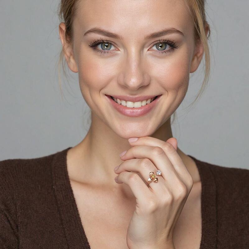 Chic and dainty. This open ring features the round-cut stone raised high by three polished petals and a heart-shaped gemstone shining beautifully as a single petal to complete this artistic work. Sketching a graceful four-petal hydrangea, it expresses the profound connotation of hope and love.