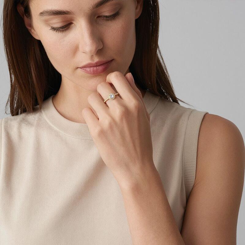 Made to create a breathtaking moment with this delicate engagement ring. This round halo has twinkly gemstones that surround the brilliant center stone, and the accents flow down each side of the shank. For its dazzling design, your beloved one must fall into love with it at a glance.