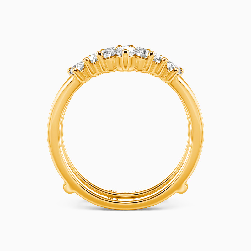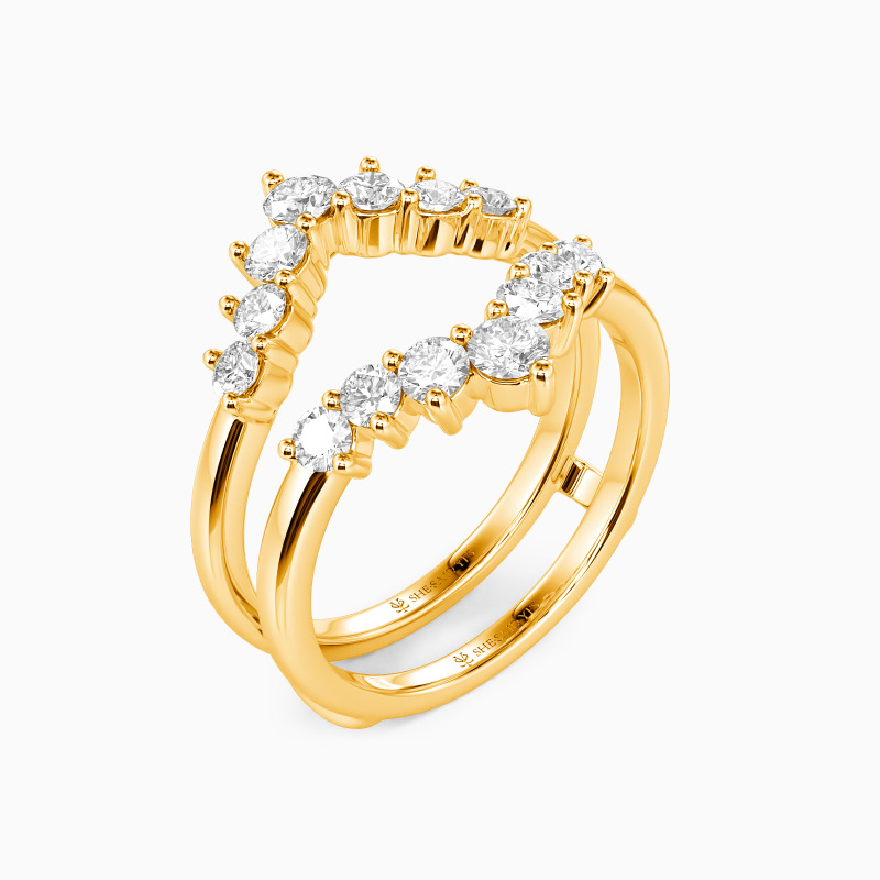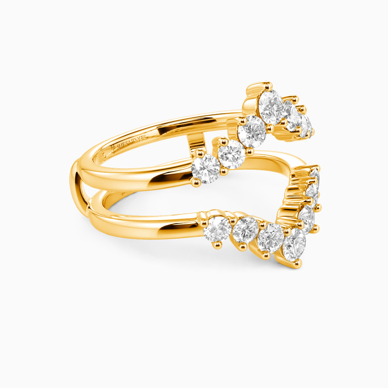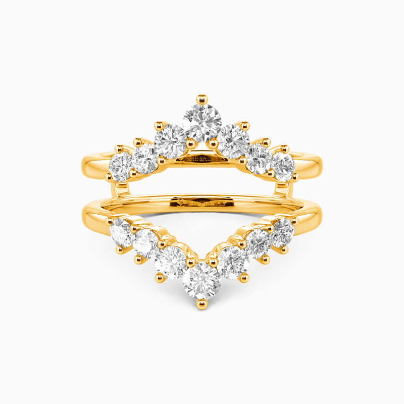 The chevron enhancer is a bold and elegant piece, designed with a graceful V-shape that frames and enhances any ring. Adorned with shimmering round gems, it adds a radiant sparkle and a touch of modern sophistication. Perfect for elevating your bridal look, it's a versatile statement that blends timeless beauty with contemporary design.