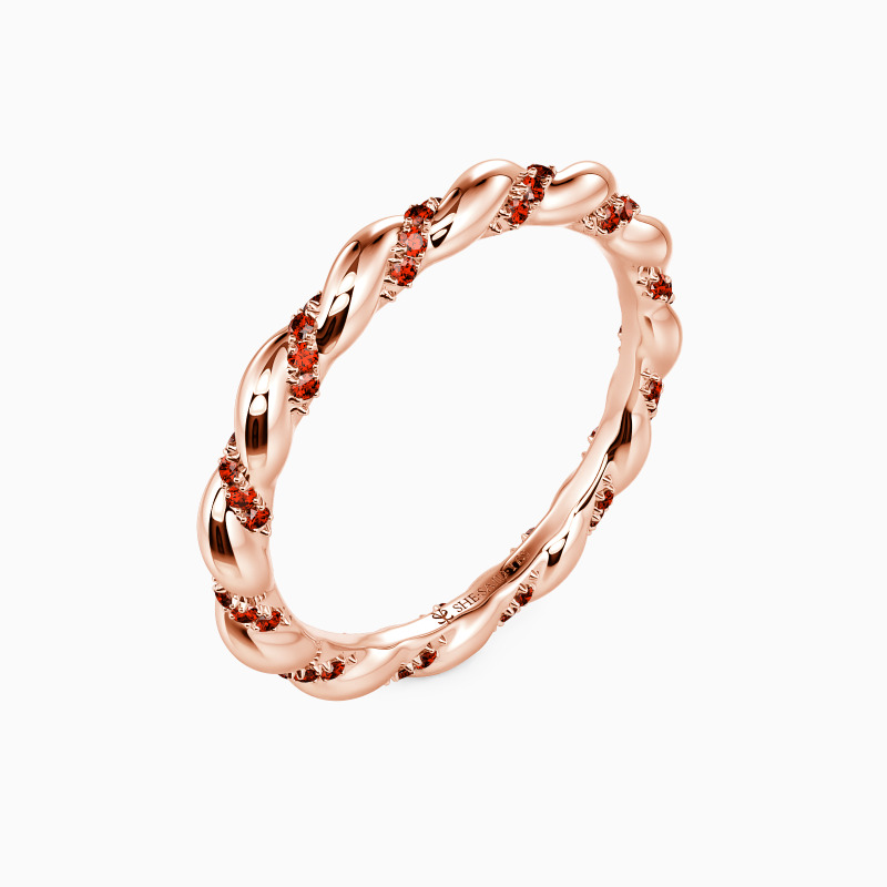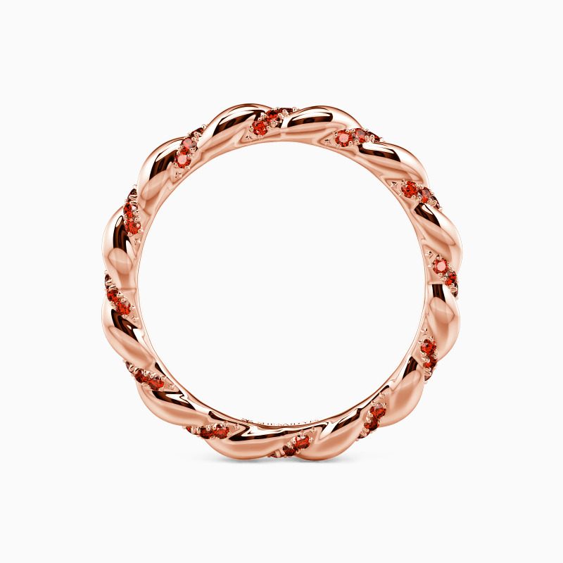 This wedding band glimmers as a standout piece. It radiates sophistication, formed by the syncing of two elegant ribbons, one polished metal and one glittering with gems. When worn individually or alongside a partner, its intricate design ensures all eyes will be drawn to its finely crafted details and balanced, intertwining composition.