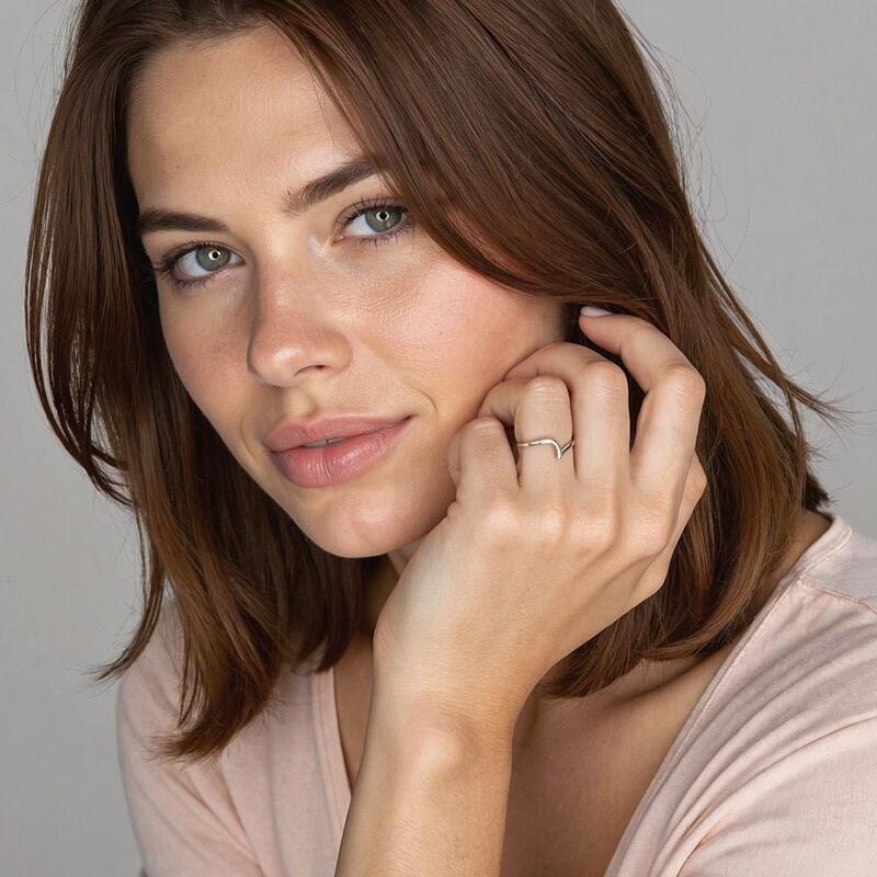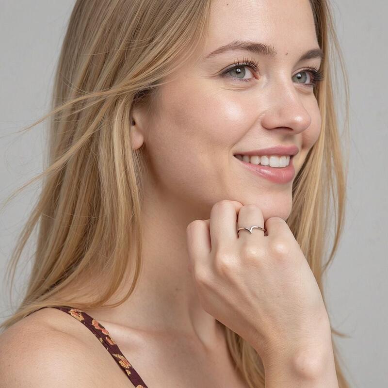 Minimalist and graceful. The attractive glamour of this wedding band comes from the unique curvy design. Two sides of the sleek ribbon arches toward each other in the center oppositely, creating a unique wave-like style with unparalleled elegance. It can not only fit your engagement ring but is also an excellent piece for daily looks.
