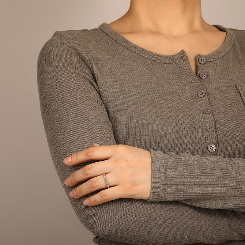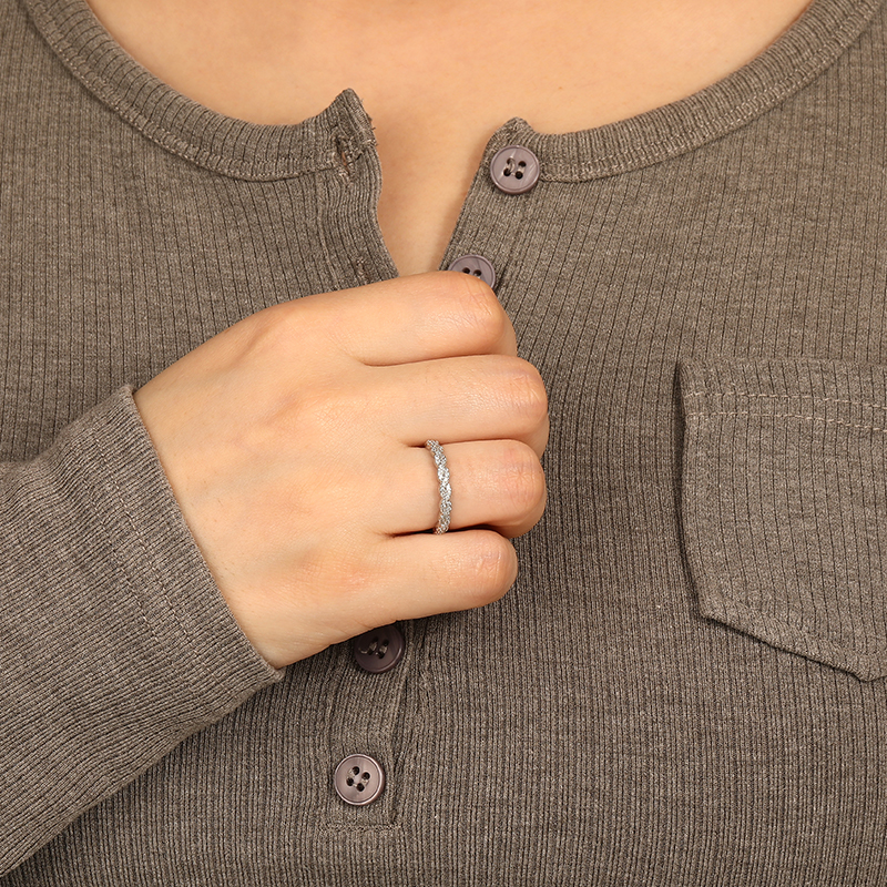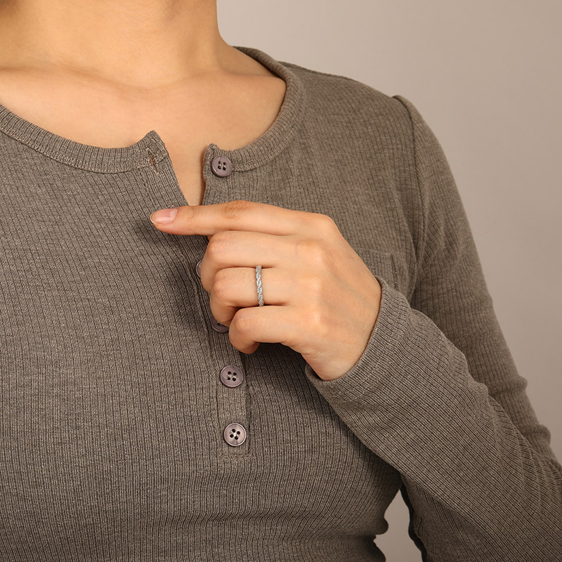 This wedding ring represents the unbreakable bond between two hearts in love. The intertwined shank design is beautifully crafted to display your commitment to each other. Two rows of elegantly paved gemstones create an unbroken circle of beauty and add sparkle to the whole piece. The meticulous craftsmanship and exceptional attention to detail ensure this wedding ring will remain an enduring symbol of your love for many years to come.