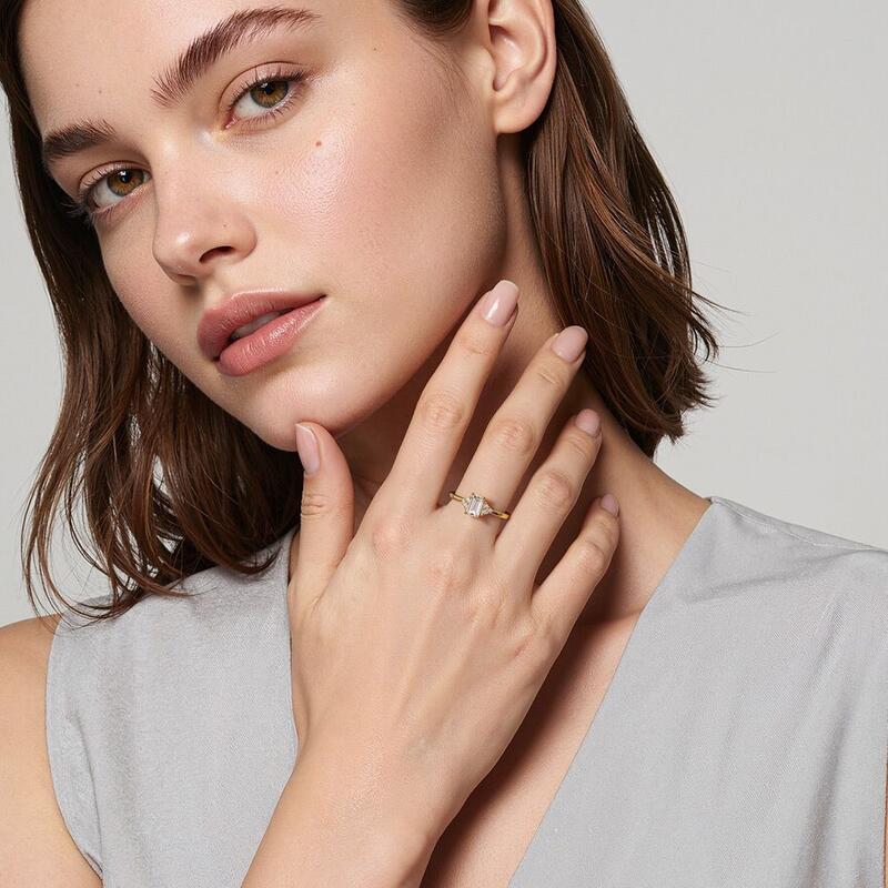 This side-stone ring features an emerald-cut center stone, showcasing a blend of classic elegance and contemporary design. Flanked on each side by clusters of three round gems, the arrangement creates a balance of refinement and brilliance. This combination of geometric precision with a touch of whimsy crafts a piece that speaks to a love that is both enduring and ever-evolving.