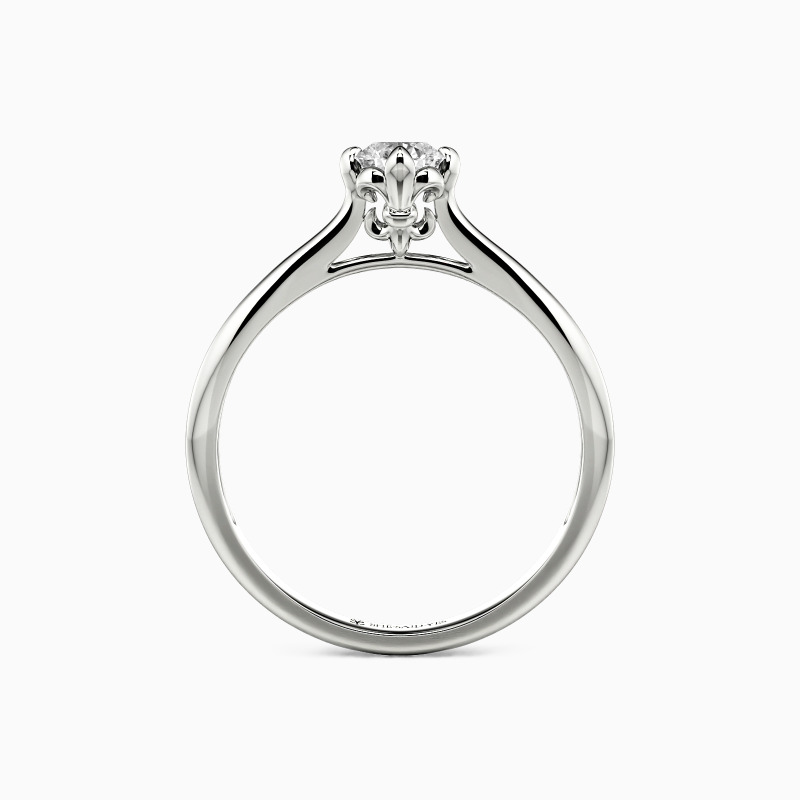 Classical and graceful. Held by the elegant setting of the fleur-de-lis, the round-cut center gem shimmers its own brilliance on the polished tapered shank. With the different widths of the shank, this solitaire ring with timeless glisten will stretch your finger and create an unforgettable memory for everyone in love.