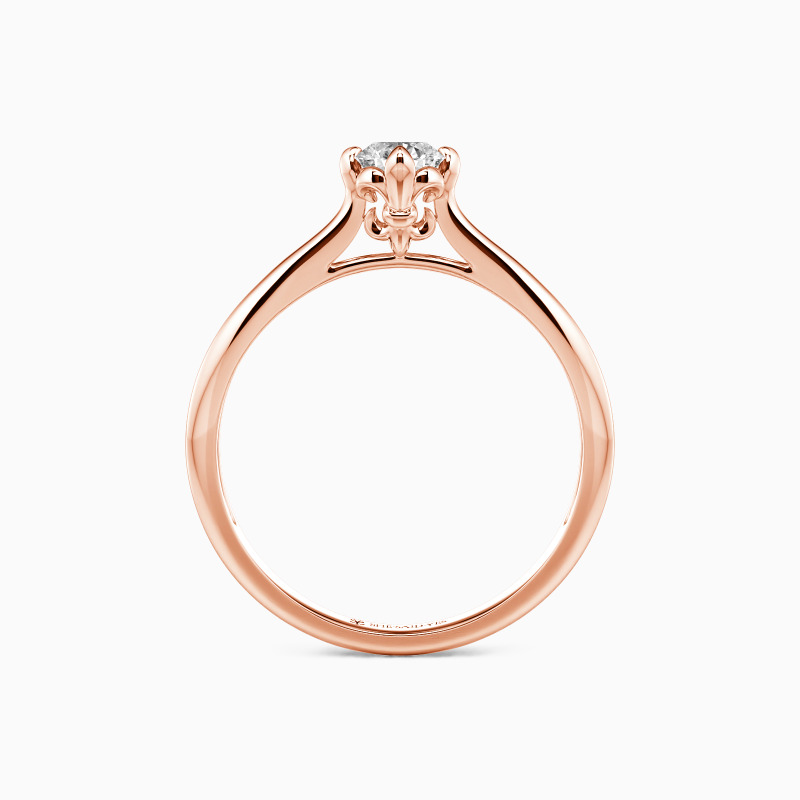 Classical and graceful. Held by the elegant setting of the fleur-de-lis, the round-cut center gem shimmers its own brilliance on the polished tapered shank. With the different widths of the shank, this solitaire ring with timeless glisten will stretch your finger and create an unforgettable memory for everyone in love.