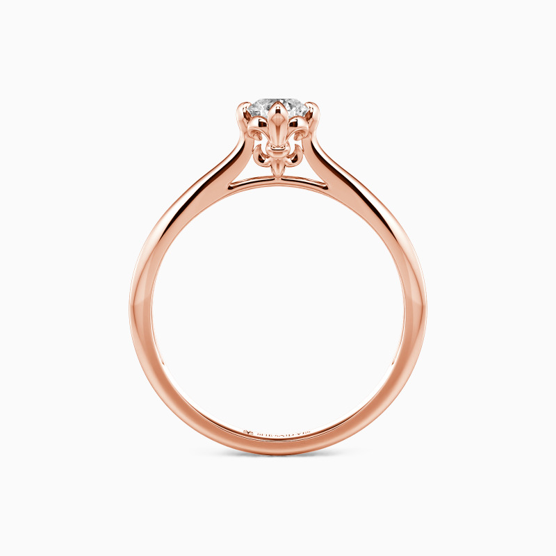 Classical and graceful. Held by the elegant setting of the fleur-de-lis, the round-cut center gem shimmers its own brilliance on the polished tapered shank. With the different widths of the shank, this solitaire ring with timeless glisten will stretch your finger and create an unforgettable memory for everyone in love.