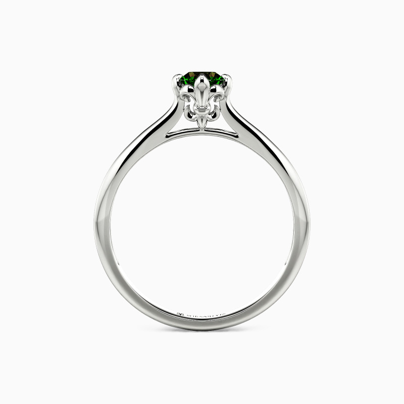 Classical and graceful. Held by the elegant setting of the fleur-de-lis, the round-cut center gem shimmers its own brilliance on the polished tapered shank. With the different widths of the shank, this solitaire ring with timeless glisten will stretch your finger and create an unforgettable memory for everyone in love.