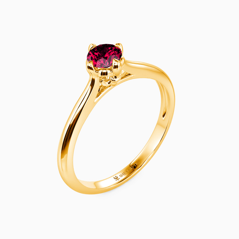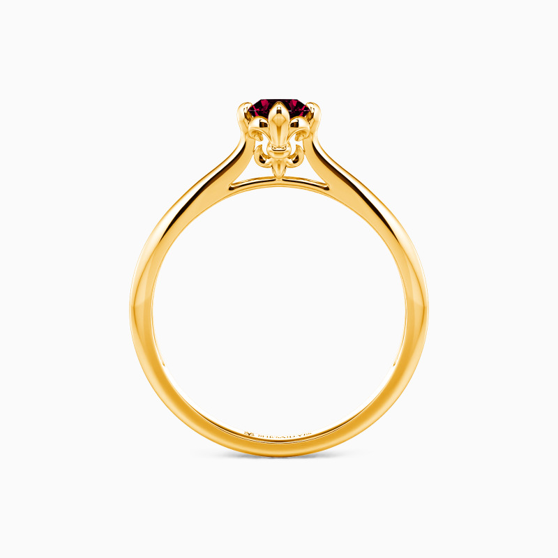Classical and graceful. Held by the elegant setting of the fleur-de-lis, the round-cut center gem shimmers its own brilliance on the polished tapered shank. With the different widths of the shank, this solitaire ring with timeless glisten will stretch your finger and create an unforgettable memory for everyone in love.