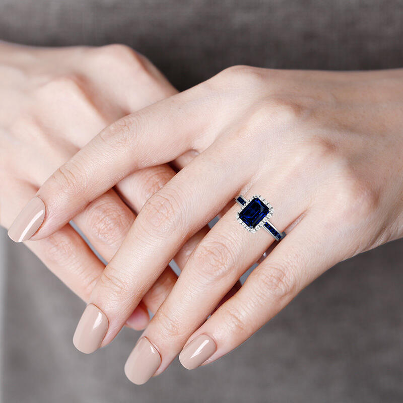 Make a vow of everlasting love with a ring that mirrors your promise. This halo engagement ring features an emerald-cut center stone with a halo of round gems accentuating its brilliance. In addition, the band, graced by a row of channel-set stones, adds more sparkle to the entire piece. This ring transforms every moment into an unforgettable memory, every gesture a testament to enduring affection.
