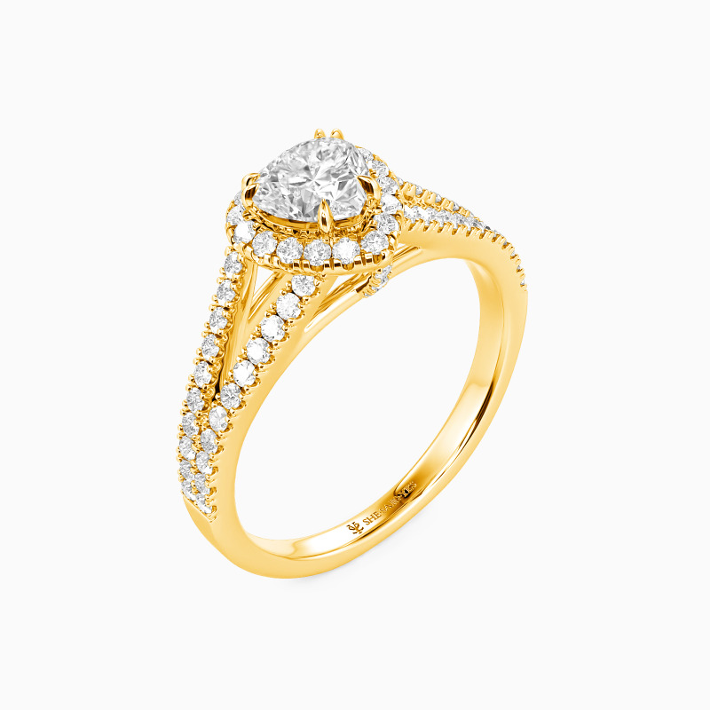 A piece of fairly exceptional jewelry from SHE·SAID·YES showcases a glistening heart-shaped gemstone highly in the middle. Adding more radiance and elegance with the flashy halo and uniquely paved Cathedral shank depicts a timeless look for a beautiful woman to enjoy as an heirloom.