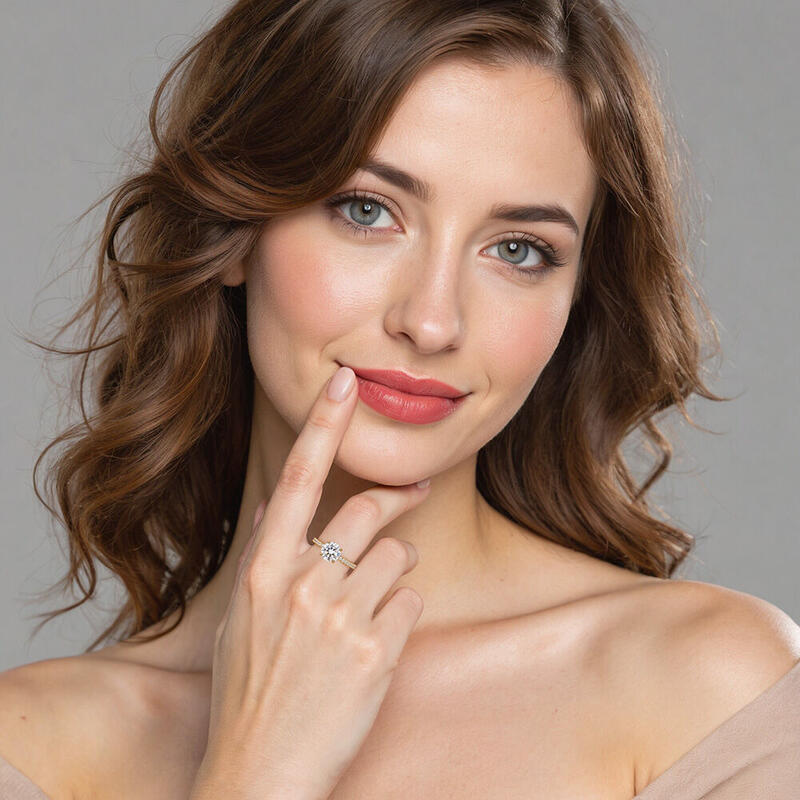 Elegant and timeless, this engagement ring showcases a breathtaking round-cut center stone that radiates brilliance from every angle. Adding a touch of enchantment, a concealed halo brings an extra layer of sophistication and sparkle. The side stones further elevate the dazzle factor, creating an exquisite symbol of your unwavering love and commitment. With its irresistible allure, this ring is designed to elicit an immediate and resounding "yes" from your beloved. Embark on an everlasting love and bliss journey with this awe-inspiring engagement ring.