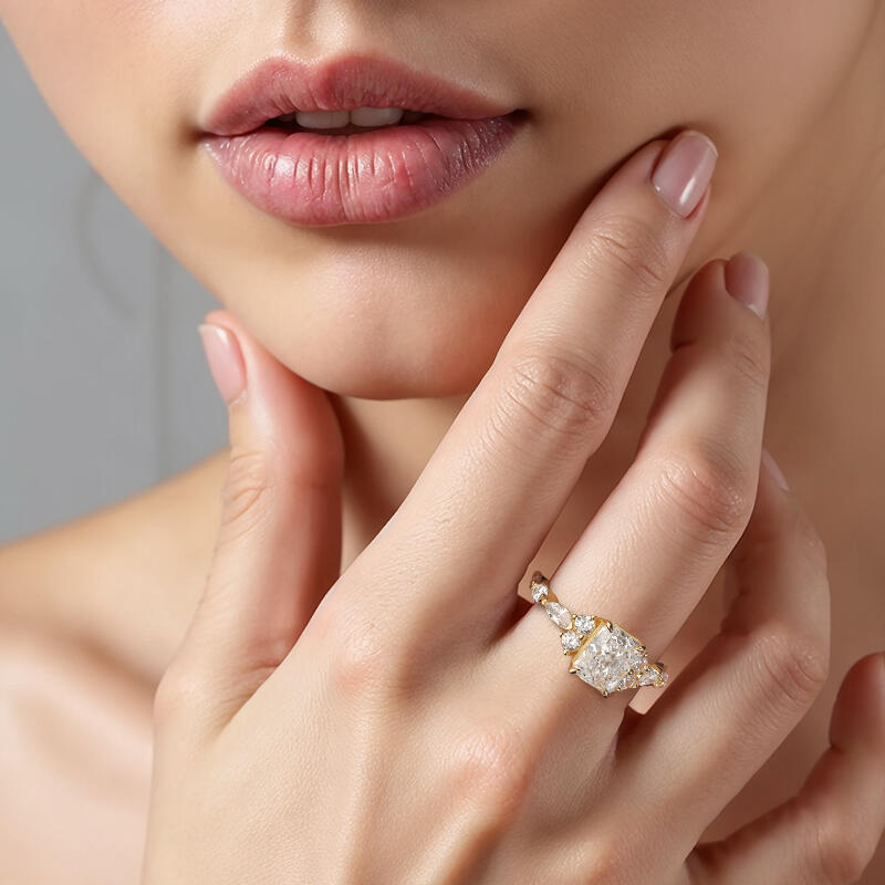 This exquisite side-stone ring features a stunning radiant-cut center stone, its brilliance amplified by twin round gems flanking each side. The band is adorned with a mesmerizing array of round and marquise cut diamond accents, creating a cascade of sparkle that flows along the finger. Its intricate design blends classic and contemporary elements, ideal for a bride-to-be seeking a ring that reflects her unique style.