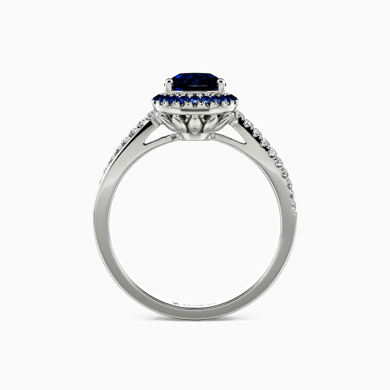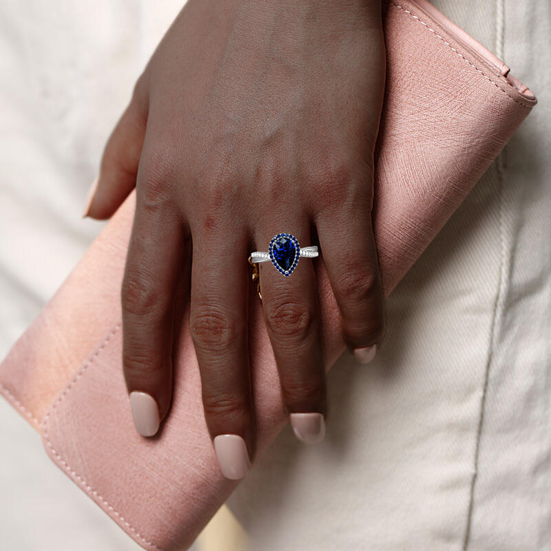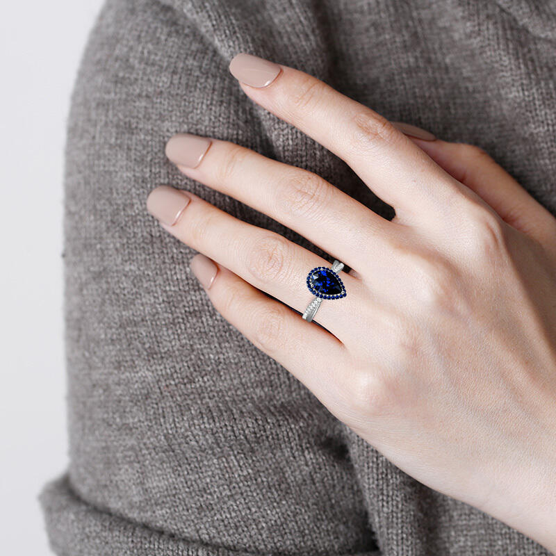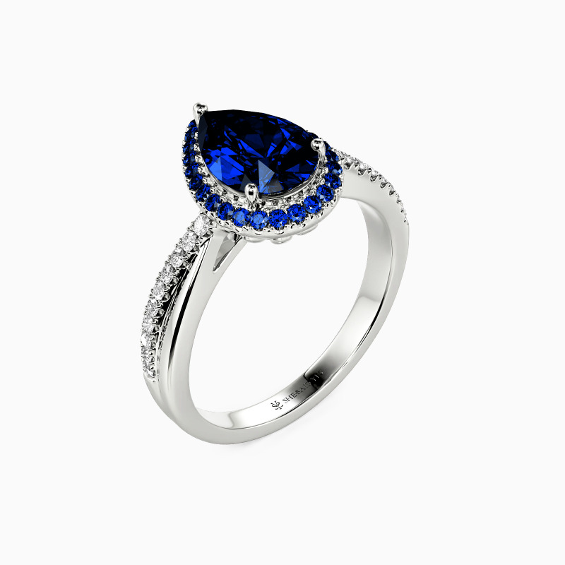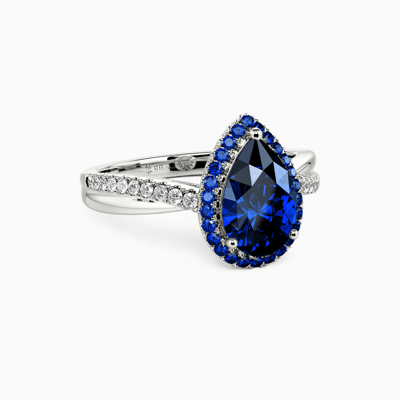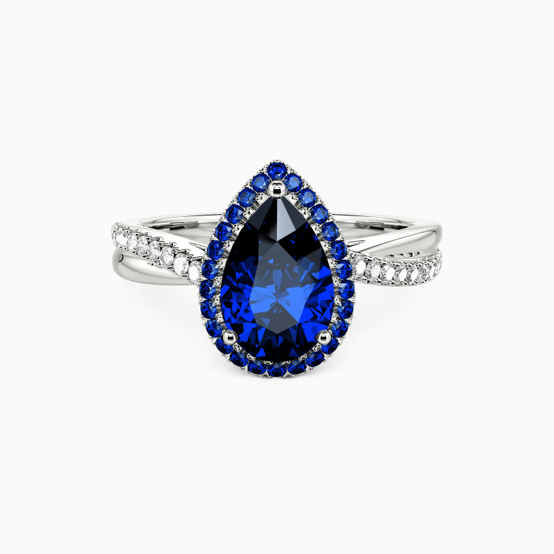 Celebrate love with this enchanting engagement ring, showcasing a pear-cut center stone embraced by a delicate halo. The shank's distinctive crisscross design offers a dual charm—one side glistens with pave-set gems, while the other exudes a smooth, polished elegance. A timeless symbol of devotion, this ring captures the essence of everlasting romance.