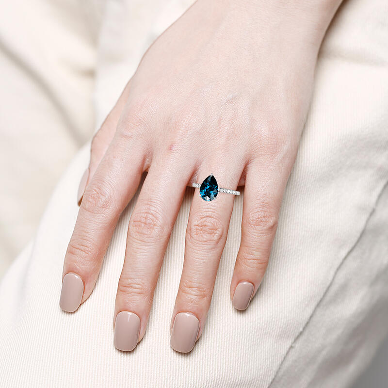 Adorn her hand with elegance and grace. This side-stone engagement ring features a mesmerizing pear-cut center stone, embraced by a hidden halo for a touch of mystery and allure. The paved shank adds brilliance and sophistication, symbolizing everlasting love and commitment. Let this ring be the embodiment of your eternal promise and devotion.