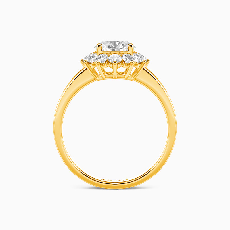 Win her heart with this floral halo engagement ring. It features a dazzling round-cut center stone in the middle, inlaid in four claws. The tightly surrounded halo is set in three prongs, making the entire head like a blooming flower. Romantic flower pluses gleaming gems, and you will definitely get a “Yes”.