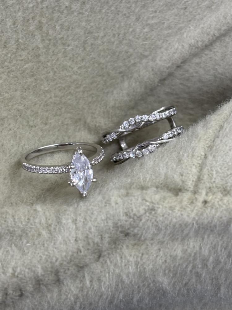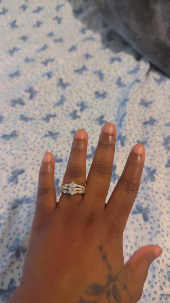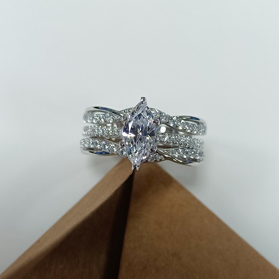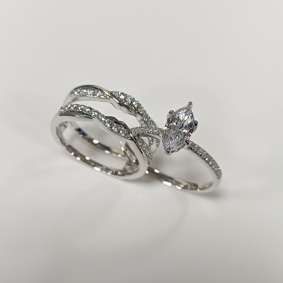 This stunning bridal set captures the essence of romance and artistry. The marquise-cut engagement ring is adorned with a hidden halo, offering a whisper of brilliance, while the paved prongs and shank showcase meticulous craftsmanship. The enhancer, a graceful intertwining of gem ribbon and polished metal, adds a touch of whimsy and sophistication, making it a dream for the contemporary bride.