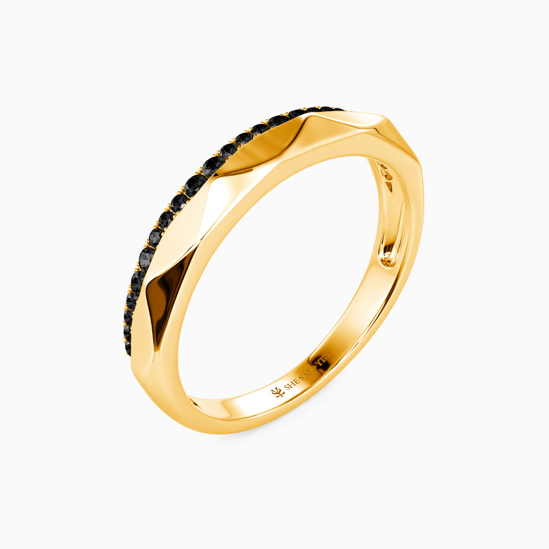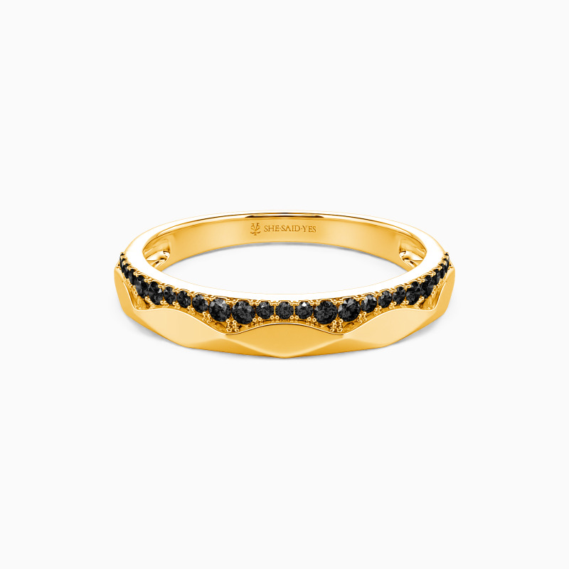 This wedding band is perfect for the modern bride who values unique, delicate, and timeless jewelry. The band's smooth surface is elevated with shimmering gemstones delicately adorn on one half, while the other half features a modern twist, with sleek rhombus facets that imbue the piece with texture. The combination of gemstones and rhombus facets results in a truly captivating masterpiece that draws the eye and captures your heart. Make a statement on your wedding day with this stunning and one-of-a-kind piece.