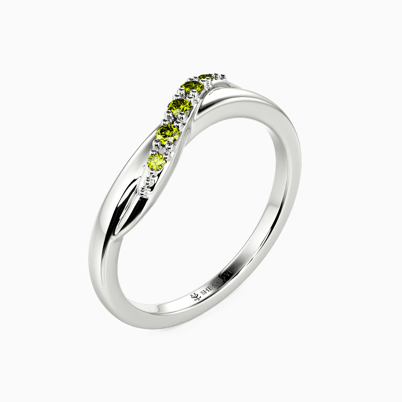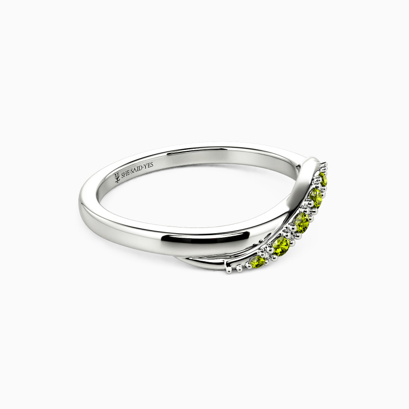 Delicate and radiant, this wedding band boasts a flawless high-polish design that enhances its brilliance. At its heart, a sparkling ribbon of gemstones winds gracefully, their facets capturing light with every turn. The seamless blend of polished metal and shimmering stones creates an effect that's both refined and eye-catching—perfect for a touch of understated glamour.